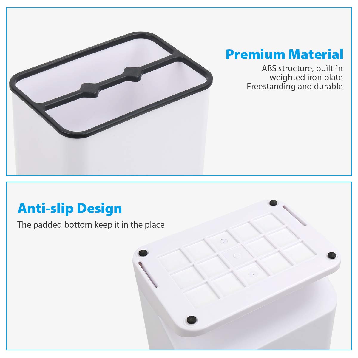 -☂Freestanding & Strong & Durable. The umbrella stand for entryway is made of durable ABS construction and built-in weighted iron plate, which can store 6 umbrellas without tipping over. Our umbrella holder stand will offer you a better usage experience for storing and drying your umbrellas or walking sticks and canes.