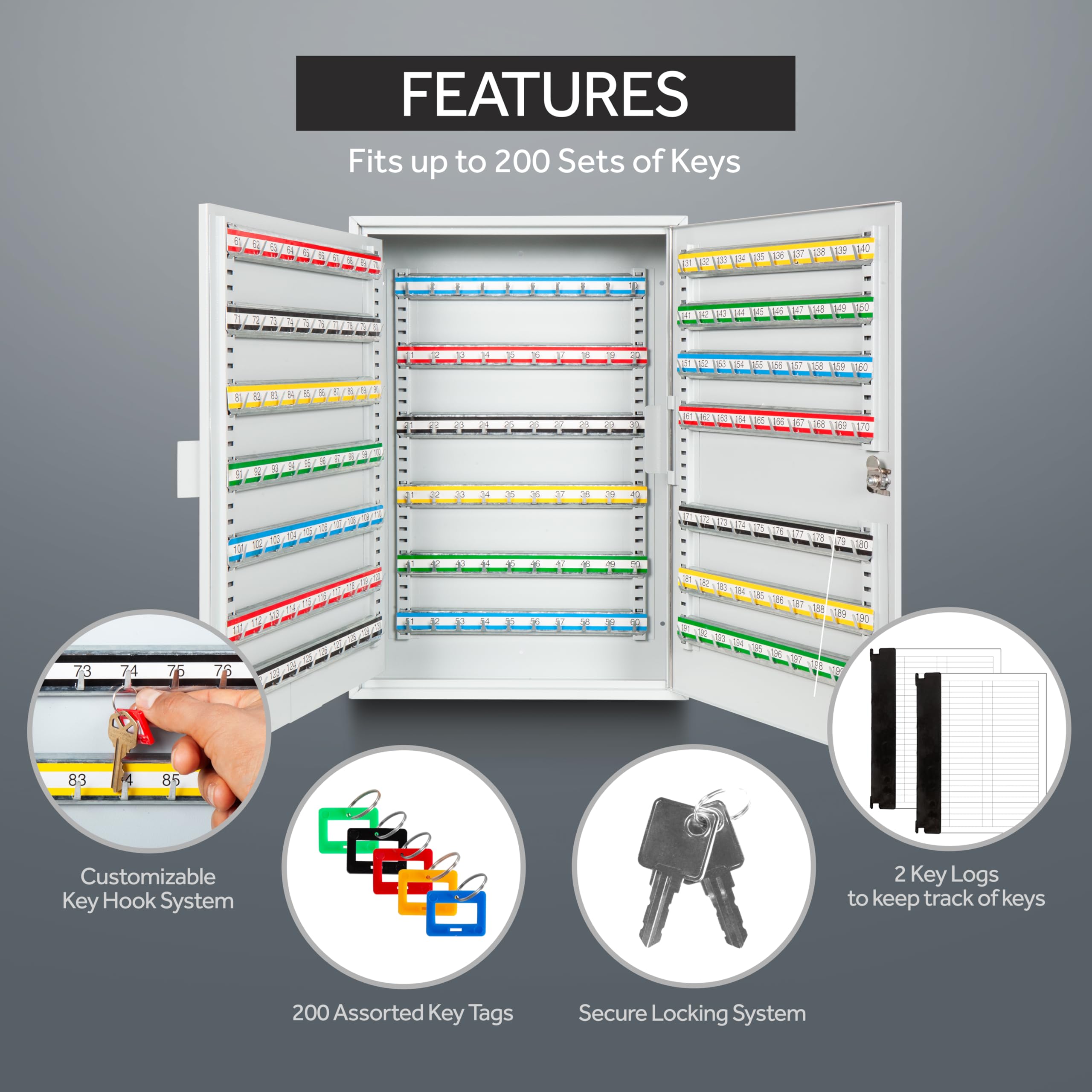 -EFFORTLESS KEY MANAGEMENT- Featuring 200 precision-numbered hooks with matching key tags, this organizer ensures quick identification and easy access. The adjustable hook system allows for customized storage, while the structured log sheet provides tracking and accountability. Includes two precision-cut keys for added security.