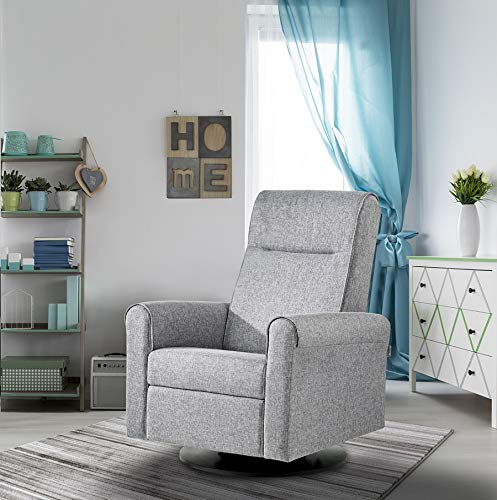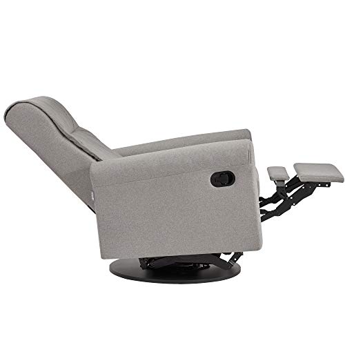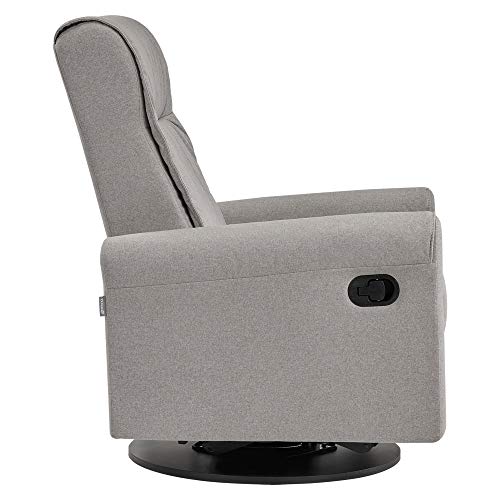 This upholstered reclining glider by Dutailier is quite eye-catching with its trendy design and its 360 swivel base. Handcrafted in Canada with only top quality materials and designed with clean lines, this glider will become a long lasting piece of furniture in your home for years to come. The integrated footrest is activated using a concealed lever on the side of the chair. You can recline the chair's backrest by applying body pressure to achieve the most relaxing position. Combined with the 360 swiveling capability and Dutailiers exclusive smooth and silent gliding system, this chair is simply unrivaled. This glider chair can easily be transitioned from the nursery to the living room. With a long-standing tradition of quality, Dutailier has never been one to sacrifice safety for style, we made sure our furniture meets the most stringent Canadian and USA safety standards (CAL117 and TSCA) especially no flame retardants and no carcinogenic products. We stand proudly behind our products with a 5 year limited warranty.