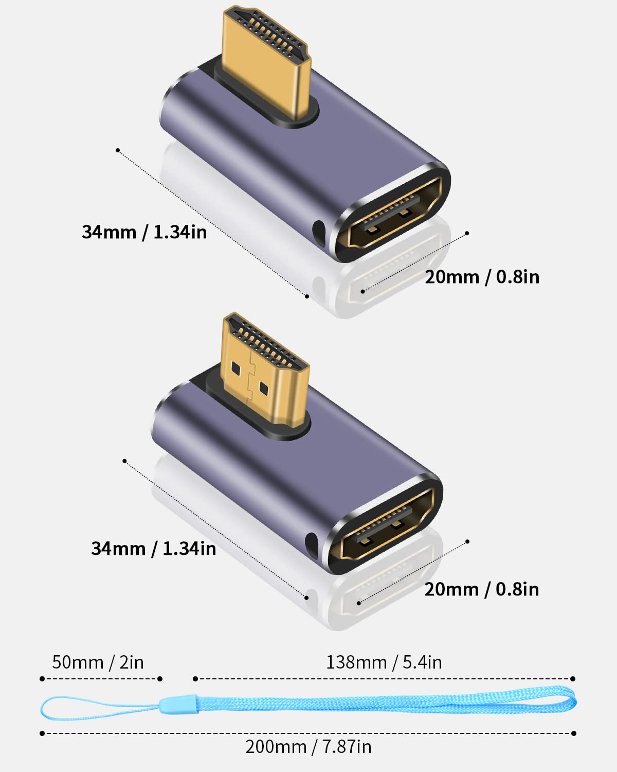 -[90 Degree HDMI Adapter] Notice: We sell a combination pack of 8K right angle HDMI adapter, including one with an Left angle and another with a right angle. These hdmi 90 degree adapter adapters come with LED indicator lights, perforation design, and two hanging ropes. Please confirm which ports you require before purchasing.