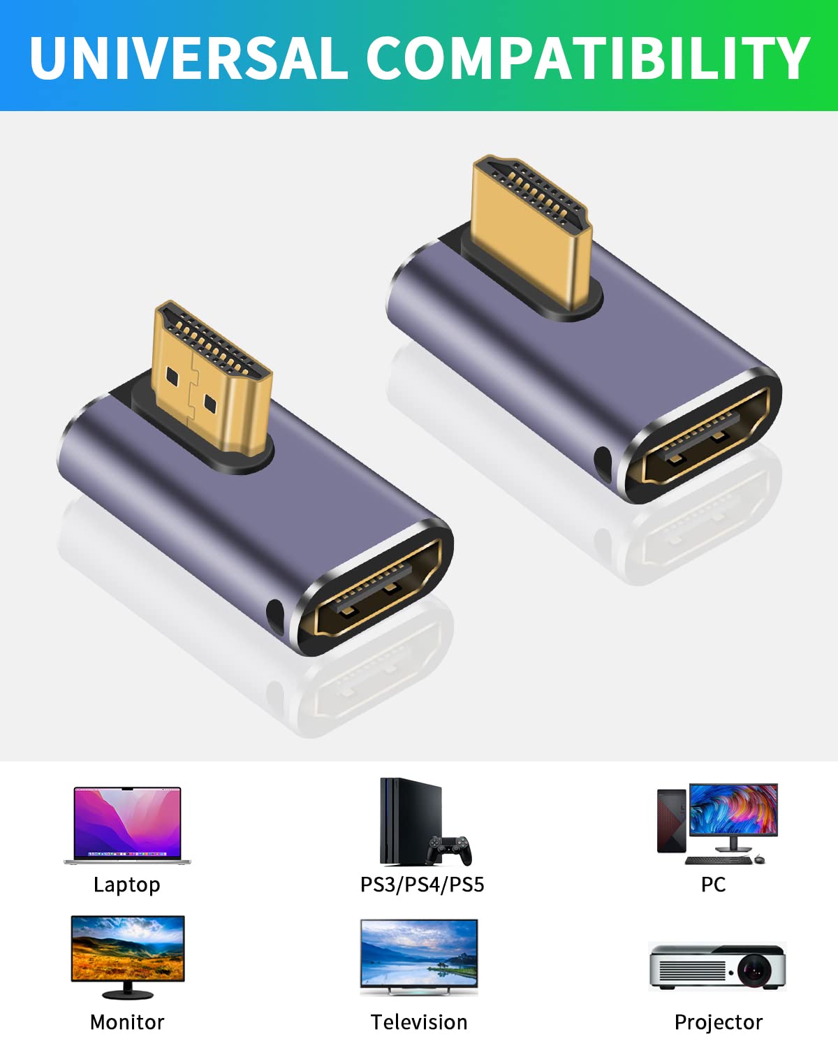 -8K HDMI angle adapter: It supports ultra-high bandwidth of up to 48Gbps, allowing for high-speed transmission of high-definition video and audio simultaneously while supporting backward compatibility. Note: In order to achieve 8K performance, your HDMI cable, device, or port must support HDMI 2.1 functionality.