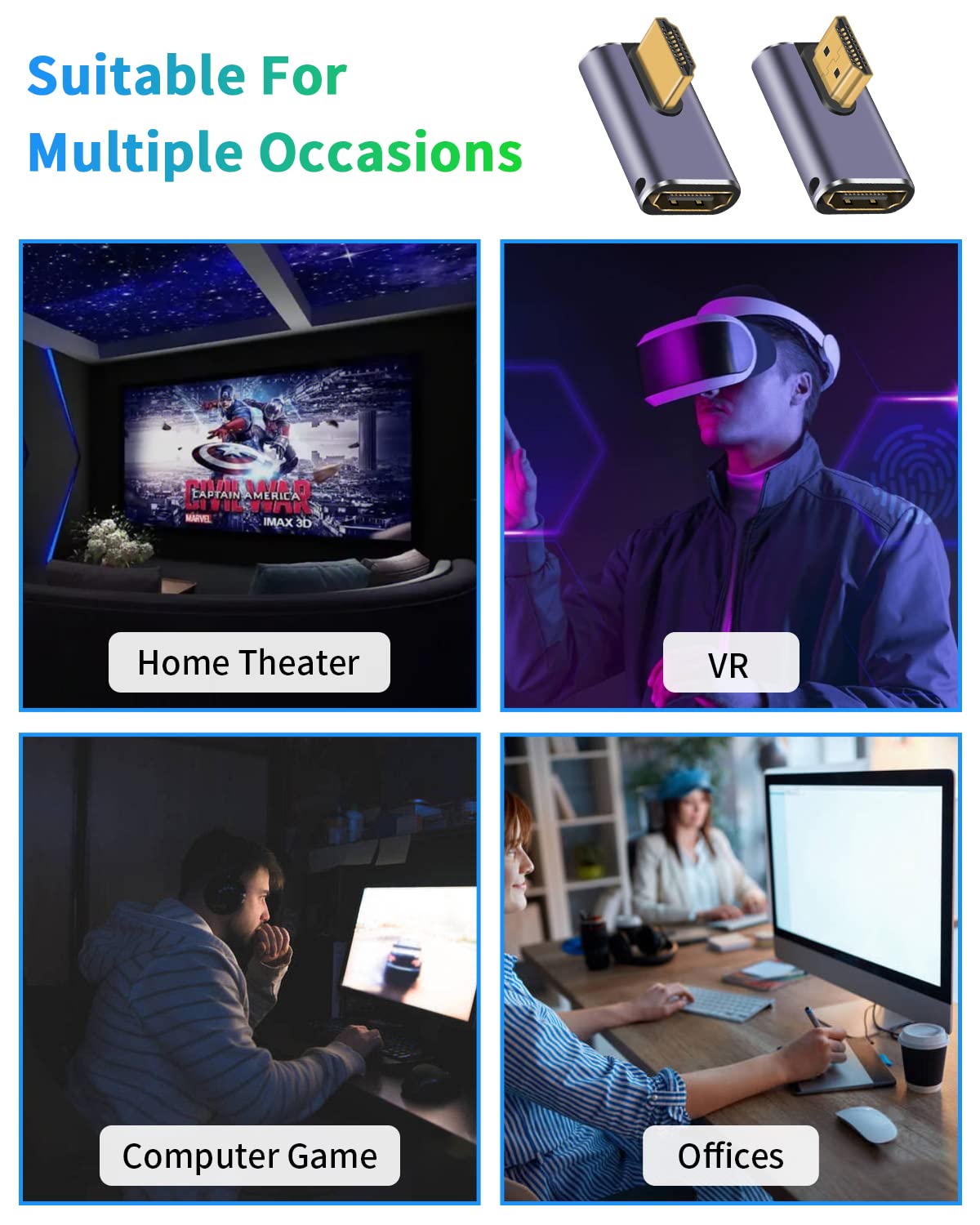 -The Right angle HDMI adapter can support video resolutions up to 8K and enable 8K@60Hz video output, while also supporting backward compatibility. With 24K gold-plated ports, the angled hdmi adapter offers faster and more sensitive plug-and-play connection. The compact and lightweight design makes it ideal for home, travel, and office use. If you have any questions, please feel free to contact us at any time.