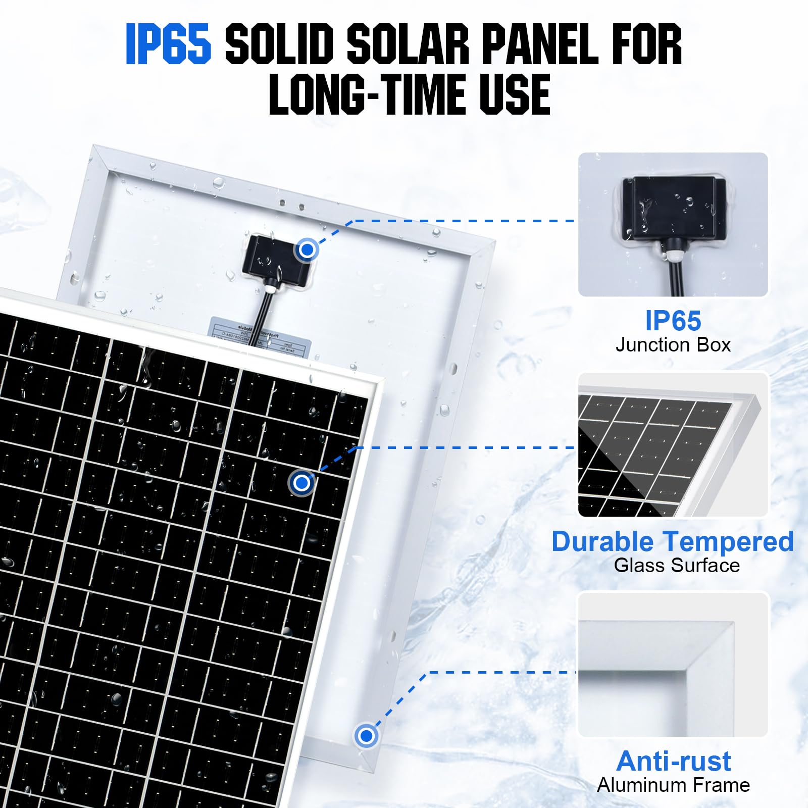 -[Durable & Reliable] Equipped with high-efficiency monocrystalline silicon cells, this 12V solar panel offers a long lifespan of up to 25 years and a low degradation rate of just 0.5% per year. Its low-iron tempered glass surface and corrosion-resistant aluminum frame ensure it is 100% waterproof and rustproof. It can withstand harsh weather conditions like sandstorms, strong winds, thunderstorms, blizzards, and hail, withstanding wind pressure up to 2400 Pa and snow load up to 5400 Pa.