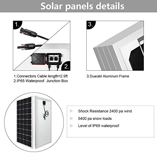 Package Include: 2pcs 100W Solar Panel 1pc 24V Stainless Steel Water Pump 1pc 20A Charge Controller 1 pairs of 16.4ft Solar Cable 2 sets of Z Mounting Brackets 24V Stainless Steel Water pump Model SPX-24-12 Cable10 feet (3m) Voltage 24V DC Amps 5.0 A Flow Rate(lph/gph) 12.0LPM/3.2GPM Maximum Lift 230 Feet (70 Meters) Maximum Submersion 100 Feet (30 Meters) Material Stainless Steel Sheel Inlet 50 Mesh Stainless Steel Screen Outlet Port 1/2" (12.7mm) Barbed Fitting Internal Bypass 105-110 PSI Max(7.2-7.5BARS) Motor Permanent Magnet Thermally Protected Pump Design Positive Displacement 3 Chamber Diaphragm Pump Package Size 15.15"x5.39"x4.52" (385*137*115mm) 100W Monocrystalline Solar Panel Related Power: 100W Open Circuit Voltage(Voc): 21.6V Max power voltage (Vpm): 18V Short circuit current (Isc): 6.11A Working current (Iop): 5.55A Temperature range: -40℃to +80℃ Frame: Heavy duty aluminum Guarantee of power: 90% with in 10 years 80% with in 25 years Kind of glass and its thickness: Low Iron, high transparency tempered glass of 3.2mm SLA Battery Voltage: 12V Size: 1010×510×35mm(39.8"x20.1"x1.4") New 20A Solar Charge Controller Battery voltage:12V/24V auto Charge current:20A Discharge current:20A Max Solar input:<50V Charge voltage:13.7V Discharge stop:10.7V Discharge reconnect:12.6V USB output:5V/2A Self-consume:<15mA Operating temperature:-20~+60 ℃ Size/Weight:138*85*30mm /150g