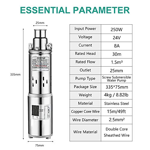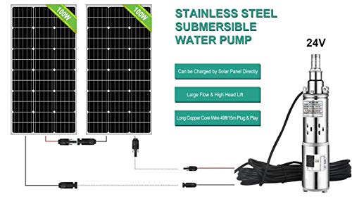400W 24V Submersible Solar Water Well Pump Kit - Using Where You Want Livestock Water Yard & garden ponds fountain system Irrigation Deep well/remote water/pumping Watering Emergency water supply situation Car washing Aquarium Package Includes: 1pc 24V 250W Deep Well Submersible Pump 4pcs 100W Mono Solar Panel 1 pair of 16.4ft Solar Cable with Connectors 1 pair of Y Branch 24V Deep Well Submersible Pump Input Power: 250W Max Flow: 1500L/H Max Head: 98ft (30M) Voltage: 24V Bearing: NSK Height*: 13.18in (335mm) Weight: 9.26lbs (4.2kg) Outlet: 1 inch Diameter: 3 inch (75mm) The Length of Cable: 49ft (15M) Motor: Brushless DC Pump Motor Materials: Stainless Steel 100W Monocrystalline Solar Panel Related Power: 100W Open Circuit Voltage(Voc): 21.6V Max power voltage (Vpm): 18V Short circuit current (Isc): 6.11A Working current (Iop): 5.55A Guarantee of power: 90% with in 10 years 80% with in 25 years SLA Battery Voltage: 12V Size: 1010×510×35mm (39.8"x20.1"x1.4")