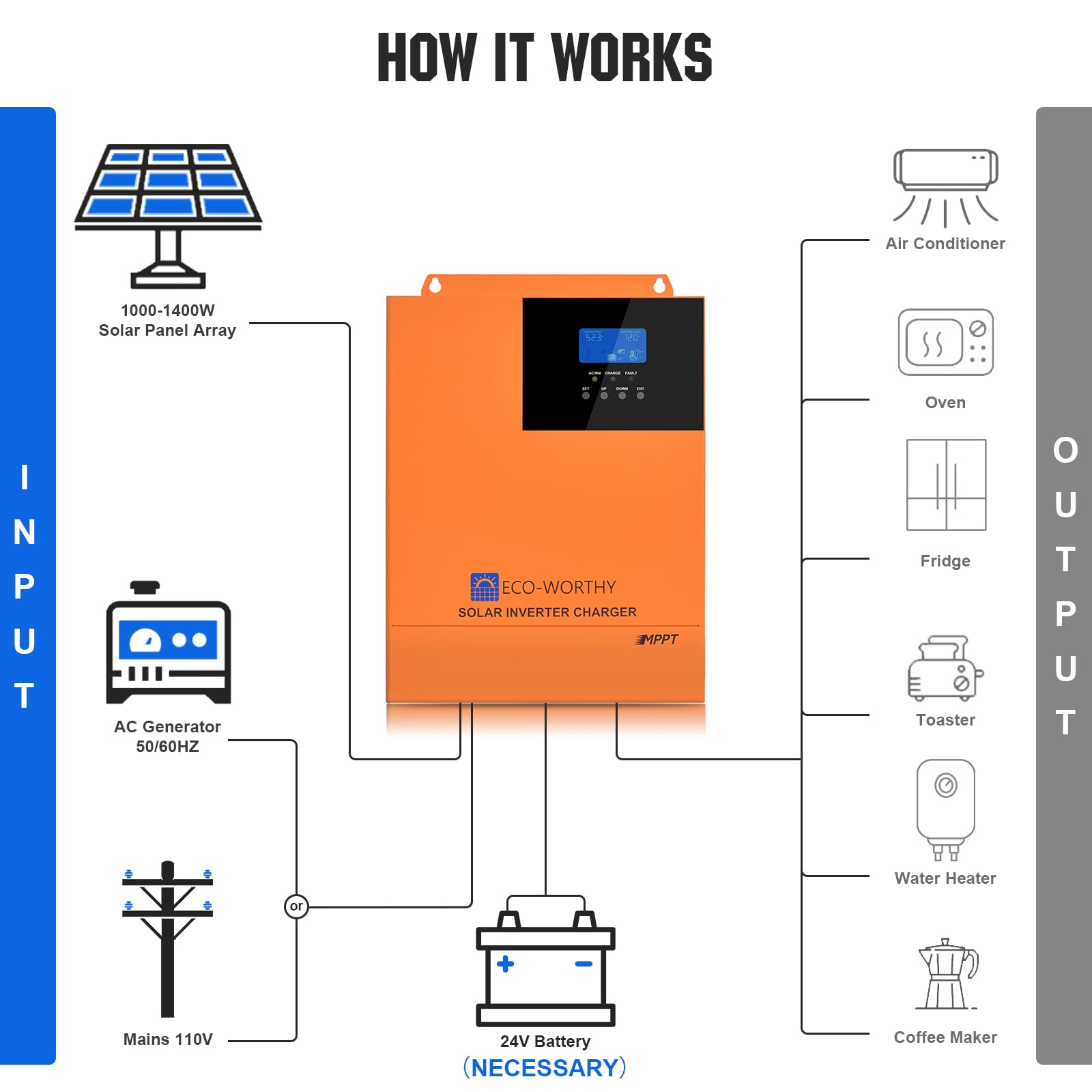 Inversor de cargador híbrido solar todo en uno ECO-WORTHY Construido en 3000W 24V Inversor de energía de onda sinusoidal pura y controlador solar MPPT de 60A para sistema fuera de la red
