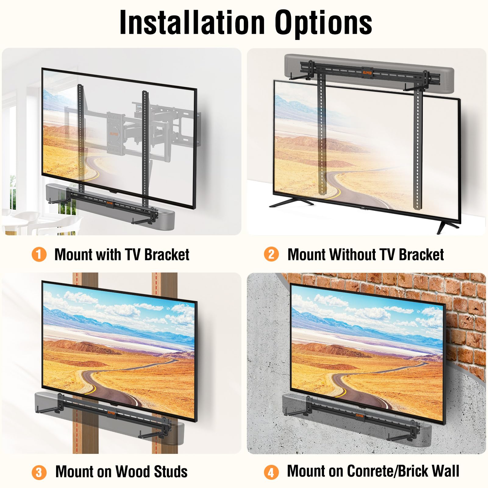 -Multiple Installations: This soundbar mount bracket has 4 installation options: Mount with TV wall mount brackets, directly mount above TV, mount on wood studs, mount on concrete/brick wall with concrete anchors included