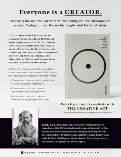 The #1 New York Times bestseller. "A gorgeous and inspiring work of art on creation, creativity, the work of the artist. It will gladden the hearts of writers and artists everywhere, and get them working again with a new sense of meaning and direction. A stunning accomplishment.” —Anne Lamott From the legendary music producer, a master at helping people connect with the wellsprings of their creativity, comes a beautifully crafted book many years in the making that offers that same deep wisdom to all of us. “I set out to write a book about what to do to make a great work of art. Instead, it revealed itself to be a book on how to be.” —Rick Rubin Many famed music producers are known for a particular sound that has its day. Rick Rubin is known for something else: creating a space where artists of all different genres and traditions can home in on who they really are and what they really offer. He has made a practice of helping people transcend their self-imposed expectations in order to reconnect with a state of innocence from which the surprising becomes inevitable. Over the years, as he has thought deeply about where creativity comes from and where it doesn’t, he has learned that being an artist isn’t about your specific output, it’s about your relationship to the world. Creativity has a place in everyone’s life, and everyone can make that place larger. In fact, there are few more important responsibilities. The Creative Act is a beautiful and generous course of study that illuminates the path of the artist as a road we all can follow. It distills the wisdom gleaned from a lifetime’s work into a luminous reading experience that puts the power to create moments—and lifetimes—of exhilaration and transcendence within closer reach for all of us.