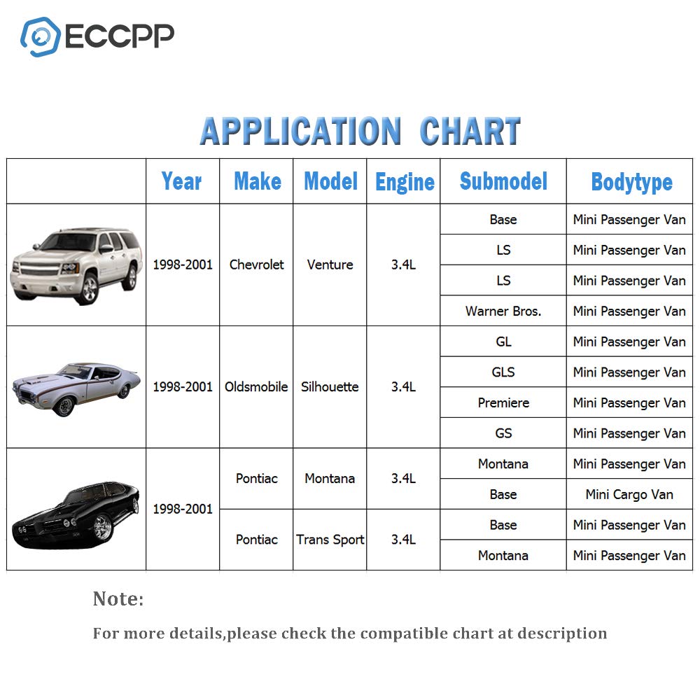 -【Application】:ECCPP Electric Fuel Pump for 1998-2001 for Chevy Venture 3.4L,1998-2001 for Oldsmobile Silhouette 3.4L,1999-2001 for Pontiac Montana 3.4L,1998 for Pontiac Trans Sport 3.4L, Please Check fitment for your vehicle Year/Make/Model on compatibility dropdown / chart. No modification necessary. Images depict actual item and necessary components.