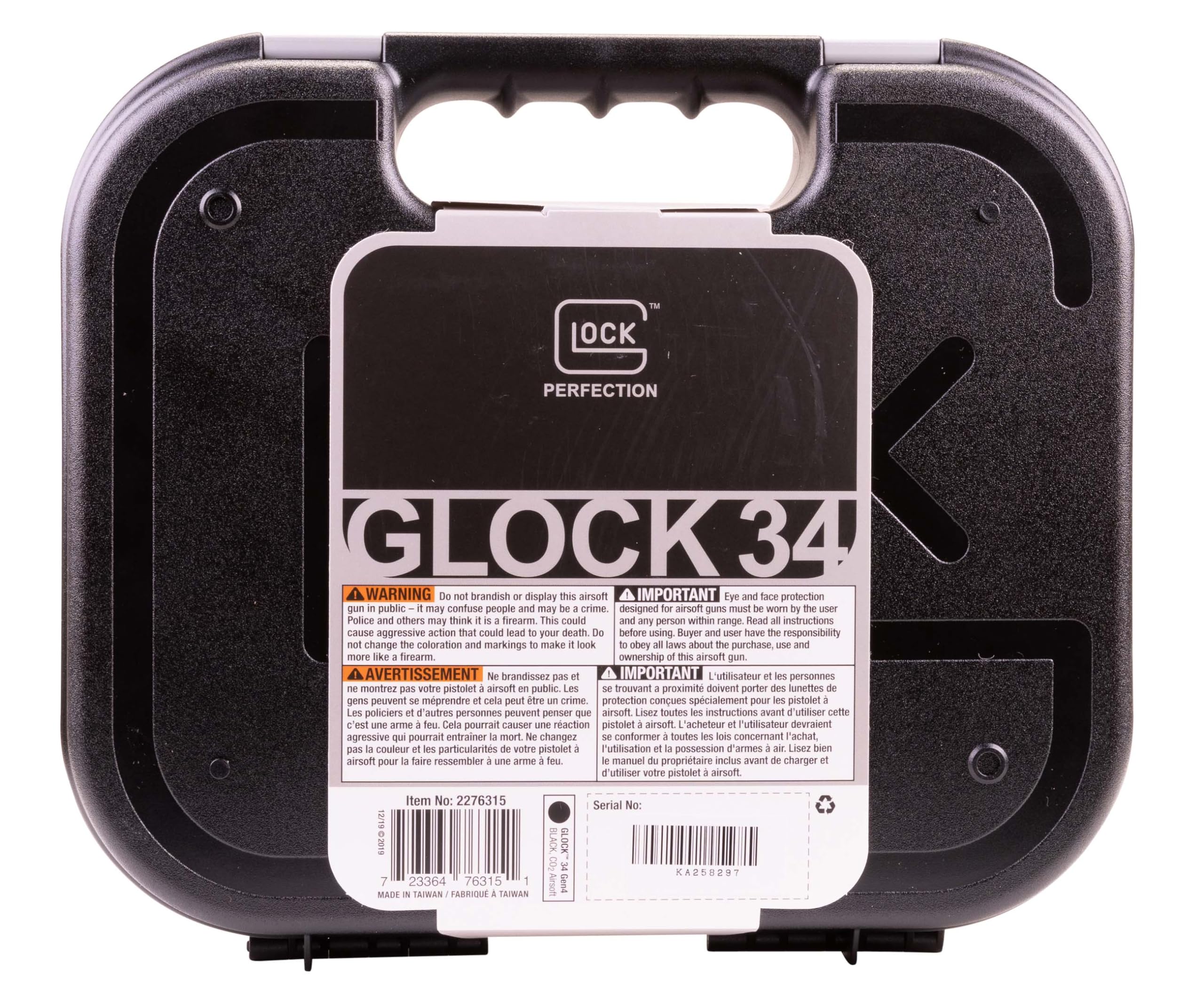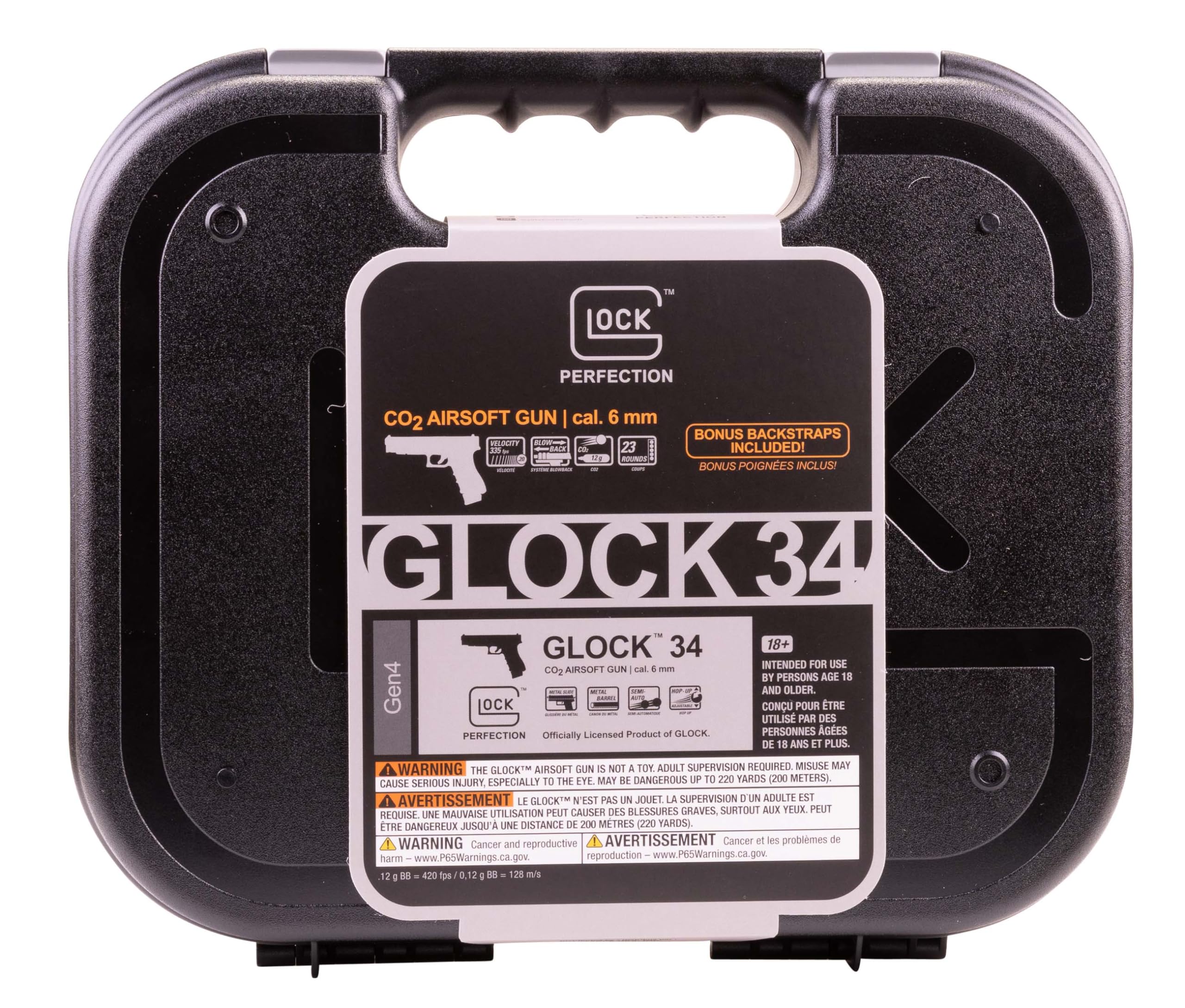 GLOCK 34 Gen4 airsoft gun is functionally identical to the original. Powered by economical a 12-gram CO2 cartridge (CO2 NOT included). Shooters will appreiate the familiar ergonomics, take-down procedure, metal slide, drop-free mag, and the realistic blowback action. Shoots 6mm plastic airsoft BBs at up to 300 fps. Great for use in airsoft play, target shooting, and as a training tool.