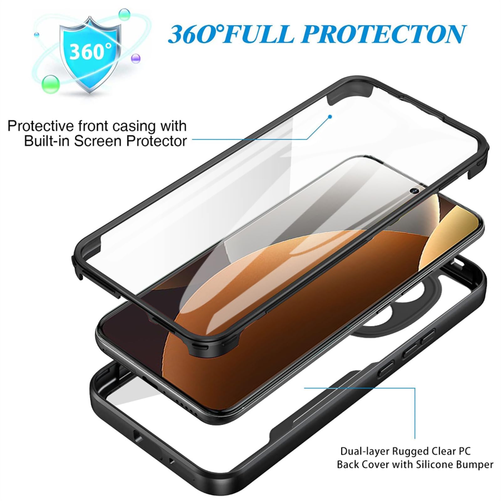 Ephoou para Xiaomi Redmi Note 15 Pro Plus 5G Funda transparente con protector de pantalla, doble capa de cuerpo completo protección a prueba de golpes a prueba de polvo todo incluido funda para 15 Pro Plus QB-Negro