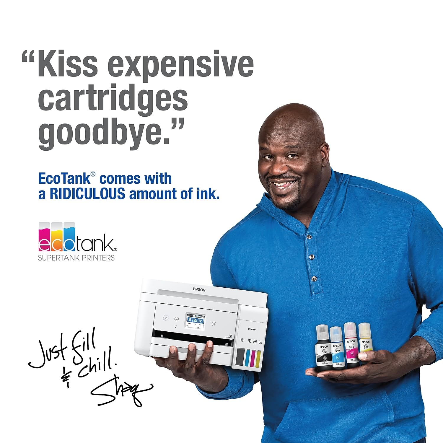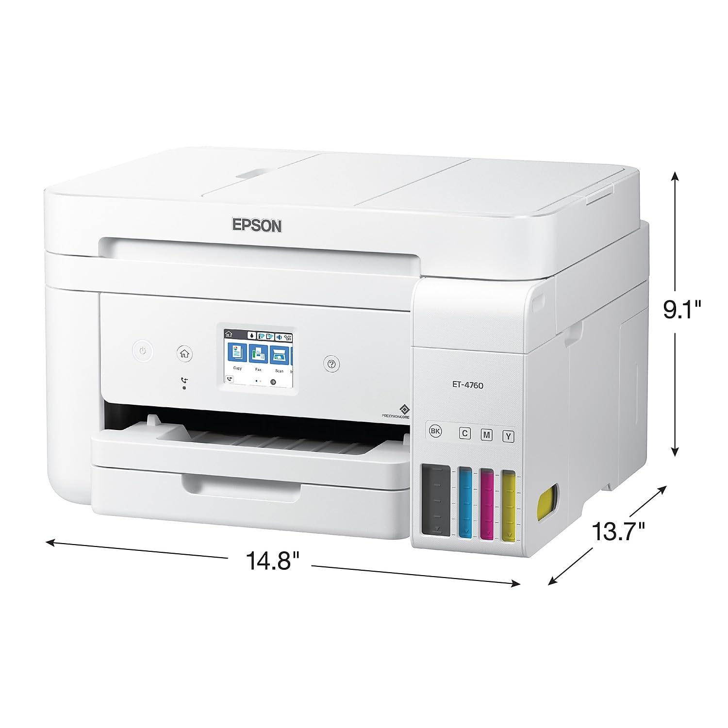 The EcoTank ET-4760 offers Cartridge-Free Printing with easy-to-fill, supersized ink tanks. You can save up to 90 percent with low-cost replacement ink bottles ― costing as little as 1 cent per color ISO page versus 20 cents with ink cartridges (1). Plus, you can get up to 2 years of ink with the included or replacement ink set (2). Each replacement ink bottle set includes enough ink to print up to 7,500/6,000 pages (be/car)(3) ― equivalent to about 80 individual cartridges (4). That means less waste. Uniquely keyed Eco Fit bottles make it easy to fill each color tank. Powered by Precision Core, this fast super tank printer also offers a 250-sheet paper tray, 30-sheet ADF, 2. 4" color touchscreen, voice-activated printing (5), and wired and wireless connectivity. *The NPD Group, Total Channel Tracking Service, U. S. & Canada, Inkjet SF/MF Printers, Refillable ink tank included, based on units, February 2019 - January 2020. Supertank printers are defined as refillable ink tank printers. 1. Savings and cost per ISO page are based on the cost of replacement ink bottles and the cost of enough standard cartridges to achieve the total page yields of the bottles using the MSRP (USD) and yields for Epson standard-capacity ink cartridges for similarly featured Epson consumer inkjet printers as of February 2019. Actual savings and costs will vary considerably based on print tasks, print volumes and usage conditions. 2. Based on average monthly document print volumes of about 200 pages. 3. Part of the ink from the included bottles is used for initial setup; yields are lower than those of replacement ink bottles. Replacement and included ink bottle yields based on the ISO/IEC 24712 pattern with Epson’s methodology. Actual ink yields will vary considerably for reasons including images printed, print settings, temperature and humidity. Yields may be lower when printing infrequently or predominantly with one ink color. All ink colors are used for printing and printer maintenance, and all colors must be available for printing. For more information, visit our official site. 4. Individual cartridges estimate based on print yields of a replacement set of Black and color ink bottles as compared to Epson standard-capacity ink cartridges for similarly featured printers as of September 2018. 5. Voice-activated printing is not available with the Epson Expression Eco Tank ET-2500 and ET-2550 printers, and Epson printers that are 5 or more years old. See our official site for device compatibility. Epson Connect account and voice-activated account registration required. 6. Most features require an Internet connection to the printer, as well as an Internet- and/or email-enabled device. For a list of Epson Connect enabled printers and compatible devices and apps, visit our official site. 7. Wi-Fi CERTIFIED; level of performance subject to the range of the router being used. Wi-Fi Direct may require printer software. 8. 12 months of standard limited or 50,000 plain paper sheets (whichever happens first). For an additional 12-month extended service plan (total of 24 months or 50,000 plain paper sheets, whichever happens first), you must register your product and use Epson genuine ink bottles.  See Limited for details. 9. ET-2600/2700/3700/4700/7700/16000 Series and ST-2000/3000/4000 Series included ink bottle yields based on the ISO/IEC 24712 pattern with Epson’s methodology. ET-7700 Series included ink bottle photo yields are significantly lower. ET-8700 included ink pack yields are estimated based on ISO/IEC 24711 test in Default Mode printing continuously. Actual ink yields will vary considerably for reasons including images printed, print settings, temperature and humidity. Yields may be lower when printing infrequently or predominantly with one ink color. All ink colors are used for printing and printer maintenance, and all colors must be available for printing. For more information, visit our official site. 10. For convenient and reasonable recycling options, visit our official site. 11. Smart Way is an innovative partnership of the U. S. Environmental Protection Agency that reduces greenhouse gases and other air pollutants and improves fuel efficiency.