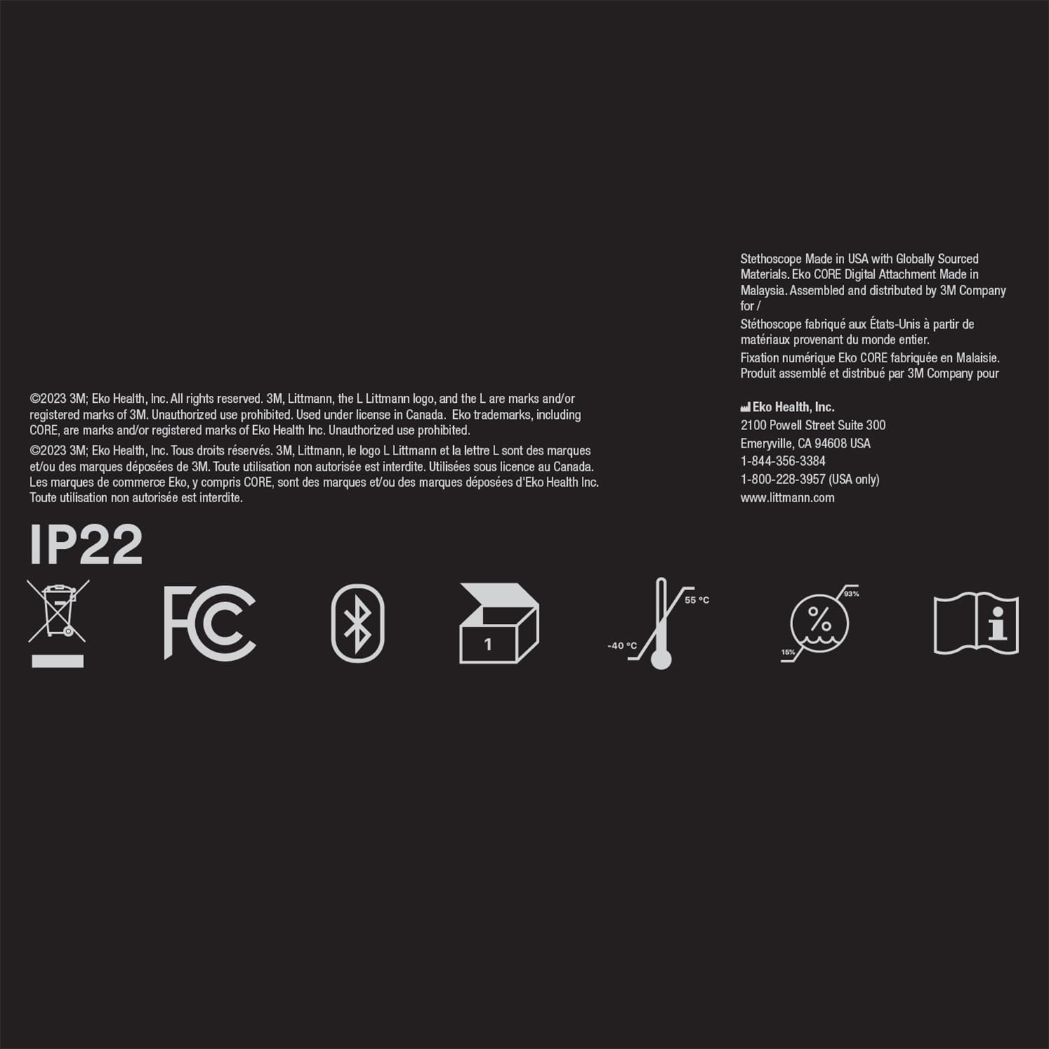 Product Description A new class of clarity The 3M Littmann CORE Digital Stethoscope features the outstanding acoustics, comfort and quality of a Littmann cardiology-grade stethoscope enhanced by powerful digital technology. Features like up to 40x amplification1 and active noise cancellation can help you auscultate with greater confidence. The 3M Littmann CORE Stethoscope connects with Eko software on a smart device2 to visualize, record and share data. (Smart device not included. Some features require a subscription.) Take listening to a whole new level The FDA-cleared 3M Littmann CORE Stethoscope toggles between analog and amplified listening modes so you can listen how you want to during assessments. Tunable diaphragm technology—a 3M invention—lets you hear different frequency sounds by simply adjusting the pressure on the chestpiece. Hold the chestpiece with light pressure on the patient to hear low frequency sounds; press a little more to hear higher frequency sounds. Soft-sealing ear tips conform to individual ears for optimal comfort and excellent sound occlusion. The 3M Littmann CORE Stethoscope works with Eko software on iOS and Android devices, giving you a HIPAA compliant means to save and annotate 15, 30, 60 or 120-second recordings in a secure dashboard. Create a library of heart sounds to monitor the progressions of a disease or for education, and securely share recordings with colleagues. 140X amplification based on comparison of analog versus electronically assisted amplified listening with maximum volume at the peak frequency (125 Hz). Manufacturer Contact Information 1-800-228-3957