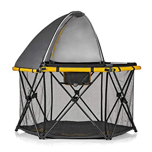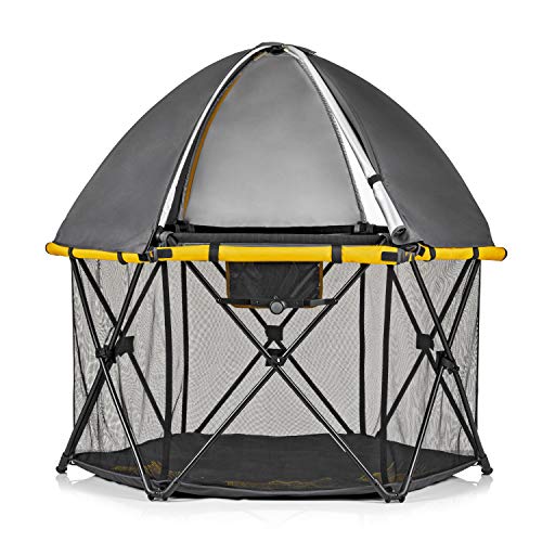 - Indoor/Outdoor Use: Portable, water resistant play area keeps your child in a safe, nearby space whether at home or on the go - Large Playing Area: With 15 sq. ft (48 wide and 27 tall), theres plenty of room for toys and play dates - Lightweight & Durable: Foldable, sturdy frame comes fully assembled with a comfortable padded floor - On the Go: Quickly fold, unfold, pack and carry in the included travel bag with shoulder strap - On the Go: Quickly fold, unfold, pack and carry in the included travel bag with shoulder strap Color:AdventurerTime to up your safety game now that your little one is on the move. The indoor/outdoor Play-Away Portable Playard Deluxe is the ultimate playpen enclosure whether heading down the street or across the country. Aside from a cup of coffee, the Play-Away will quickly become your favorite item with features youll love like a detachable UPF 50+ sun protection canopy with full or half dome coverage that is easy to unzip and adapt to your needs.Take a peek on your little one and they can peek at you through the six airy mesh side walls with roll down shades. The water-resistant padded floor is comfortable and easy to clean. Plus, the attached pouch is perfect for a touch-screen device offering a chill out or learning zone when you need a few minutes to get stuff done.The foldable, sturdy frame comes fully assembled; plus, you can quickly fold, unfold, pack and carry in the included travel bag with shoulder strap. Measuring at 15 sq. ft of play space, 48 wide and 27 tall, its just enough room for your child and compact enough for simple transport.