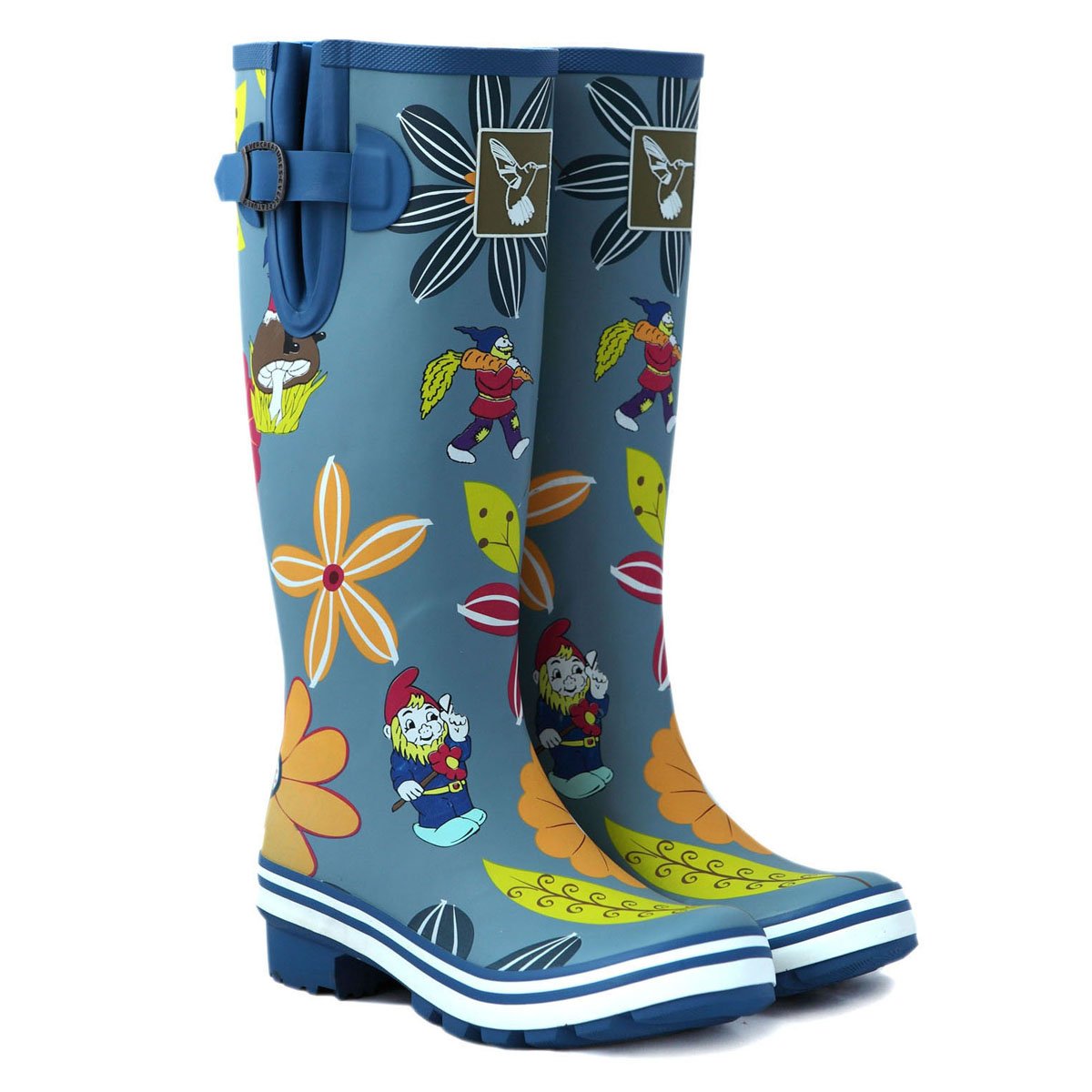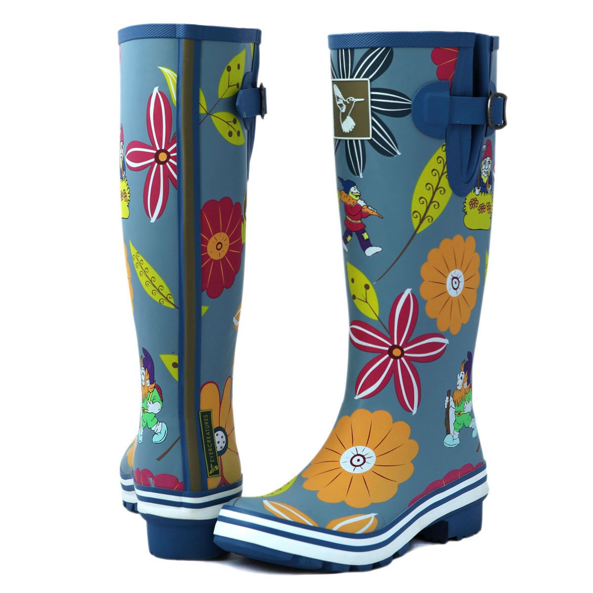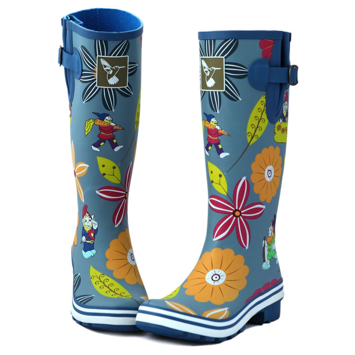 Evercreatures Botas de lluvia para mujer Botas impermeables hasta la rodilla Zapatos de jardín cómodos Botas de lluvia azules Dalhia Lindo estampado floral con hebilla ajustable, talla EE. UU. 8 (UK 6 / EU 39)