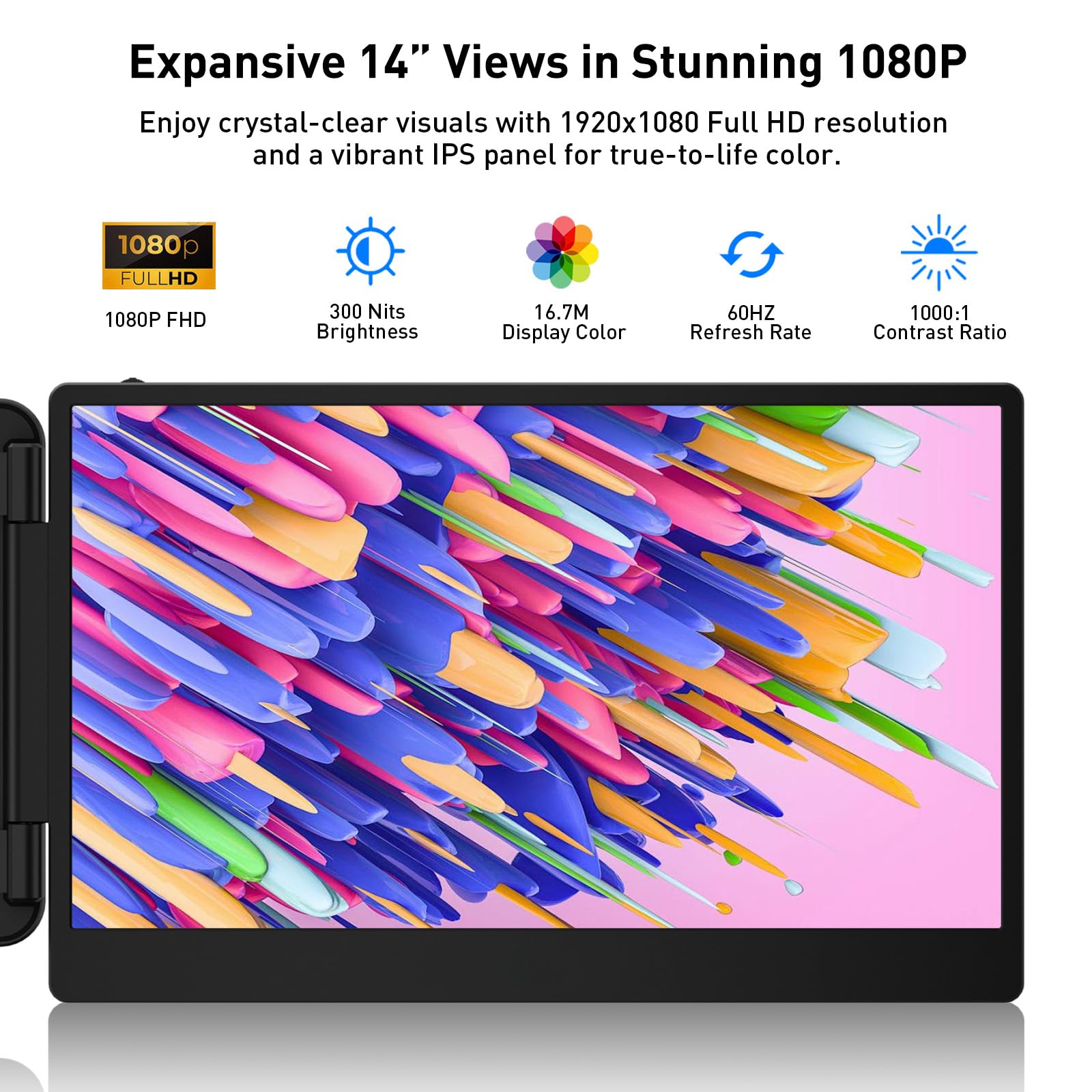 -1080P Full HD IPS Display for Crystal-Clear Visuals: This 14-inch laptop screen extender delivers 1920×1080 resolution with 72% color gamut and 300 nits brightness. Enjoy stunning image quality for design, gaming, or presentations. A real upgrade for any dual monitor setup.