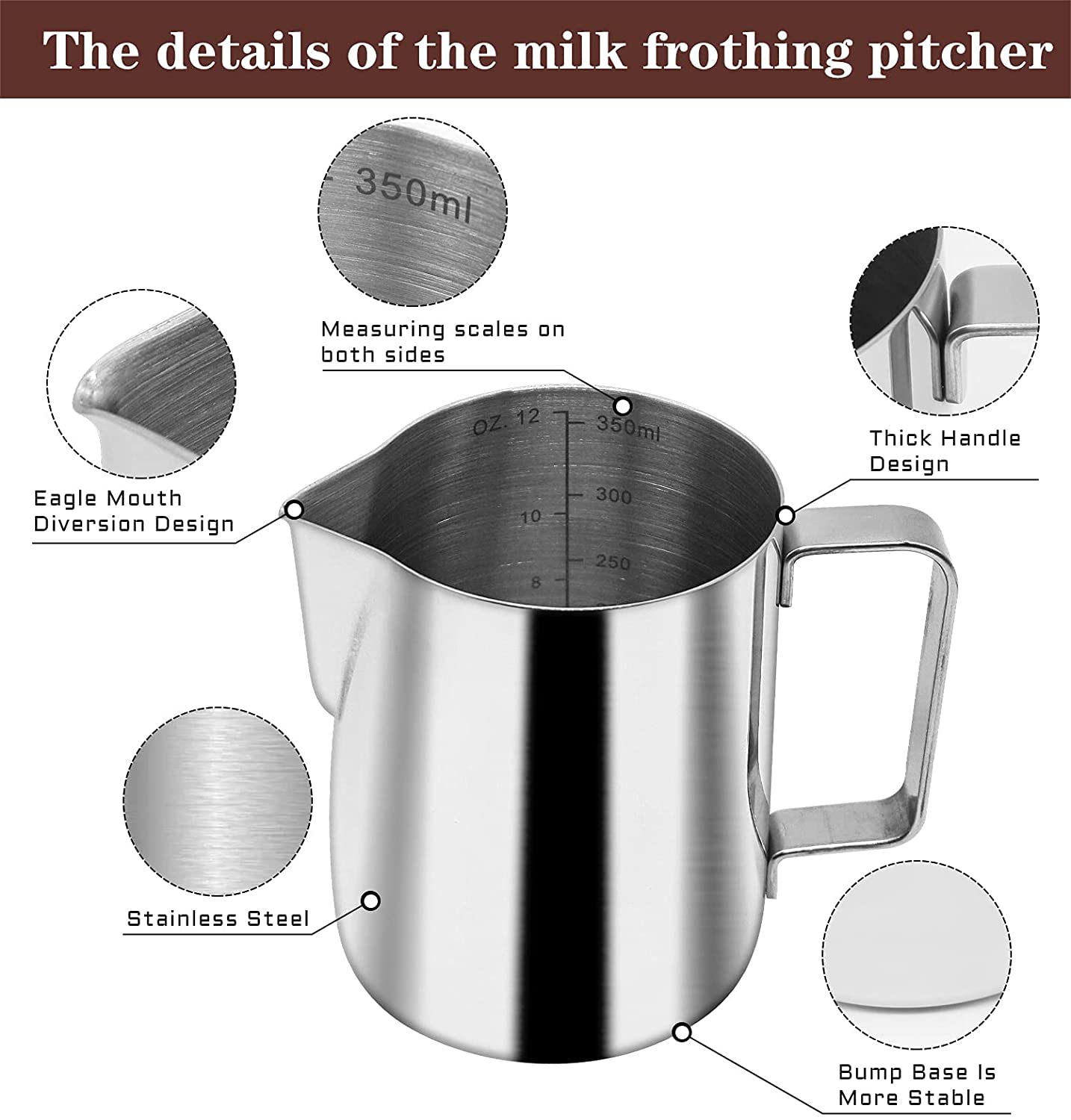 -【Barista Accessories】The milk jug (350 ml=11.836oz) made of stainless steel has a scale inside, it is robust, rust-proof and dishwasher safe. Silicone tamper mat prevents the portafilter from slipping around when stamping and protects your countertop and portafilters from damage. The professional latte art pen tool forms the beautiful coffee pattern. The decorative stencils offer a wide range of motifs and are made of plastic.