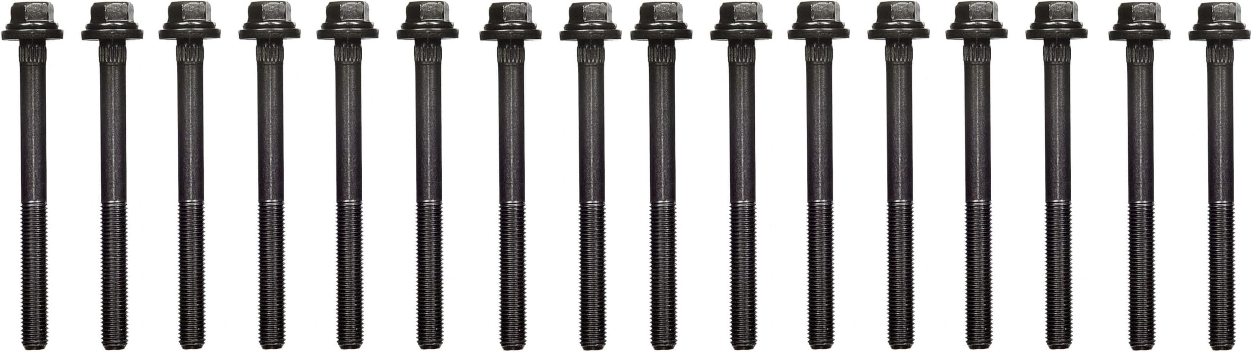 Fel-Pro headbolt kits contain a complete set of the highest quality headbolts and hardened washers available. They're cold-formed to ensure molecular integrity, then heat-treated prior to thread rolling and machining. Reduced-diameter bolt heads eliminate the need for valvetrain removal and facilitate cylinder head re-torquing. The bolts are available in a variety of head styles for fitment on specific vehicle and cylinder head applications