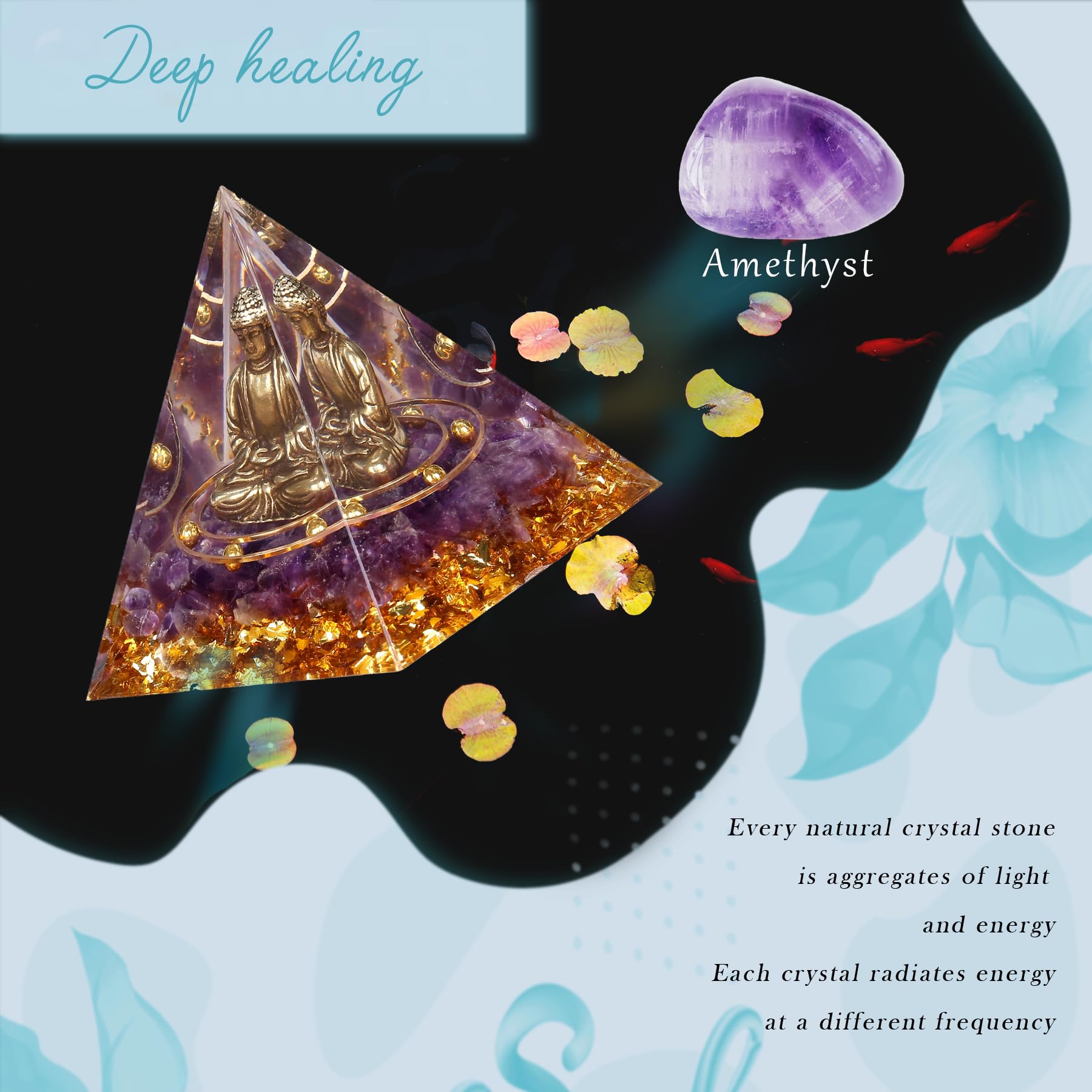 FENGSHUI-CAISHEN Pequeña estatua de Buda en pirámide de orgonita de cristal curativo, amatista con