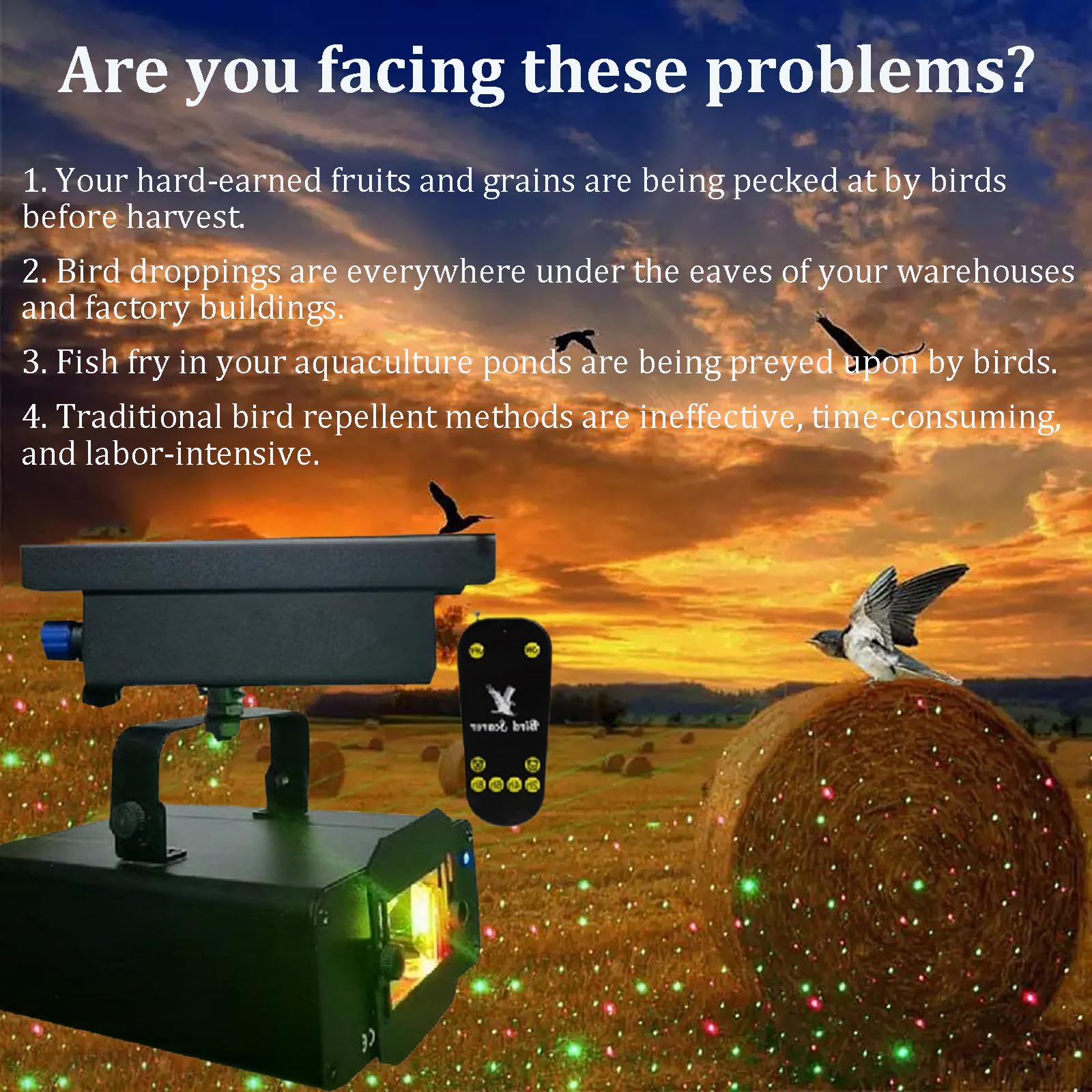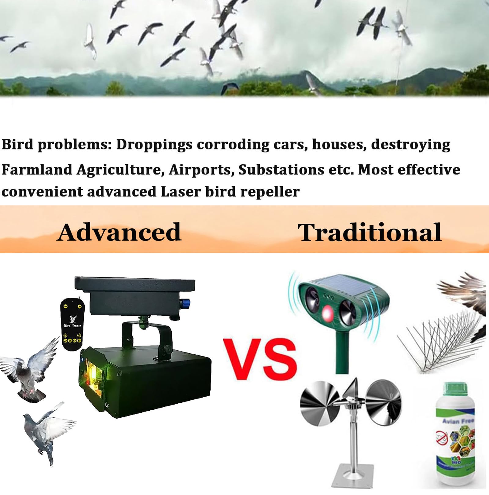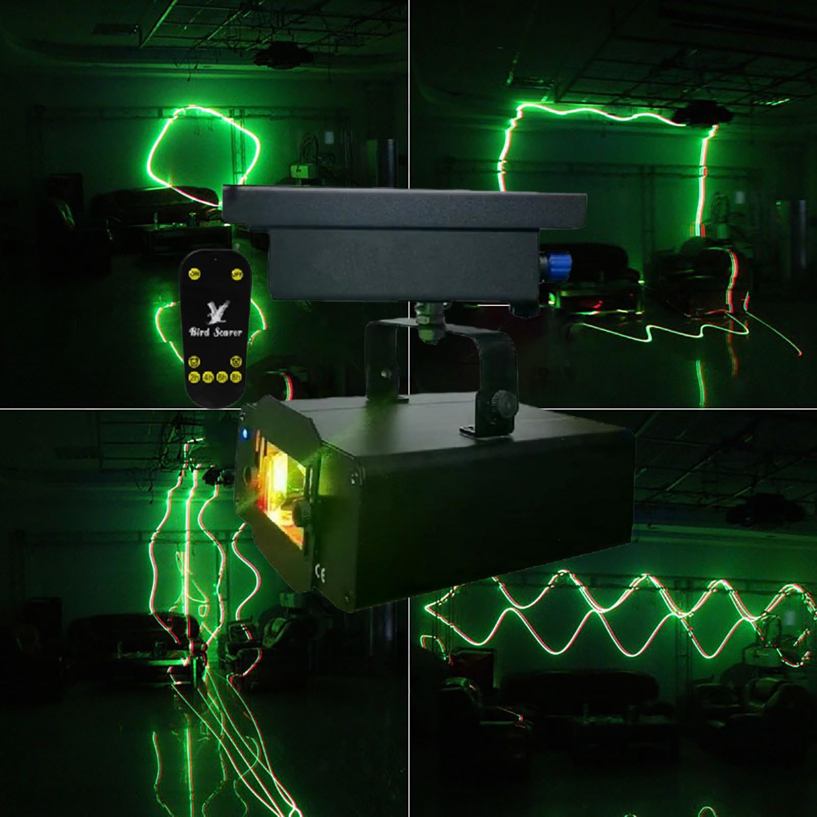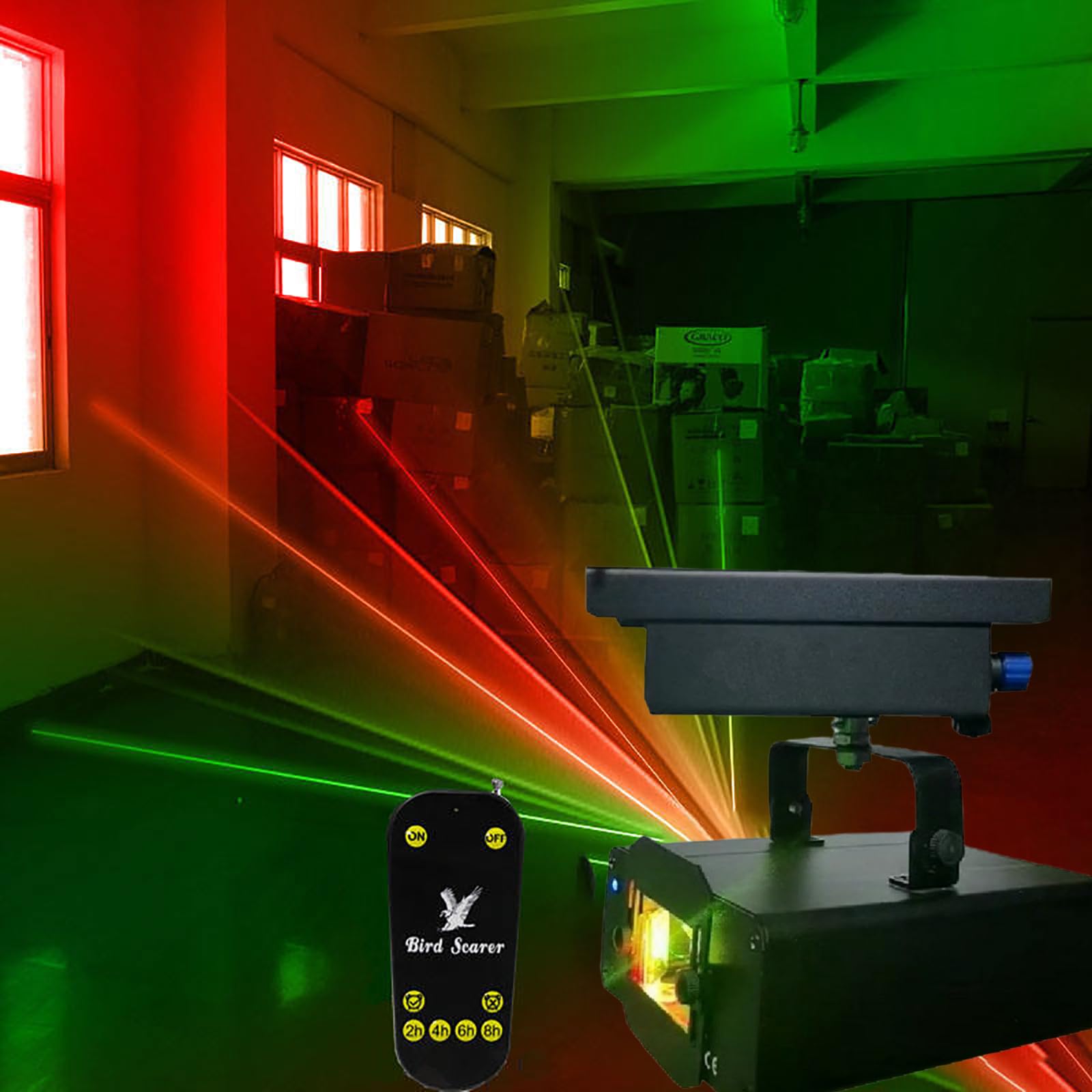 -✪ Dual-color laser system: The bird deterrent uses a red and green dual-color laser light source, simulating the visual threat signals of predators in nature, effectively stimulating the birds' instinctive fear response, increasing deterrence efficiency by 40% compared to single-color light sources