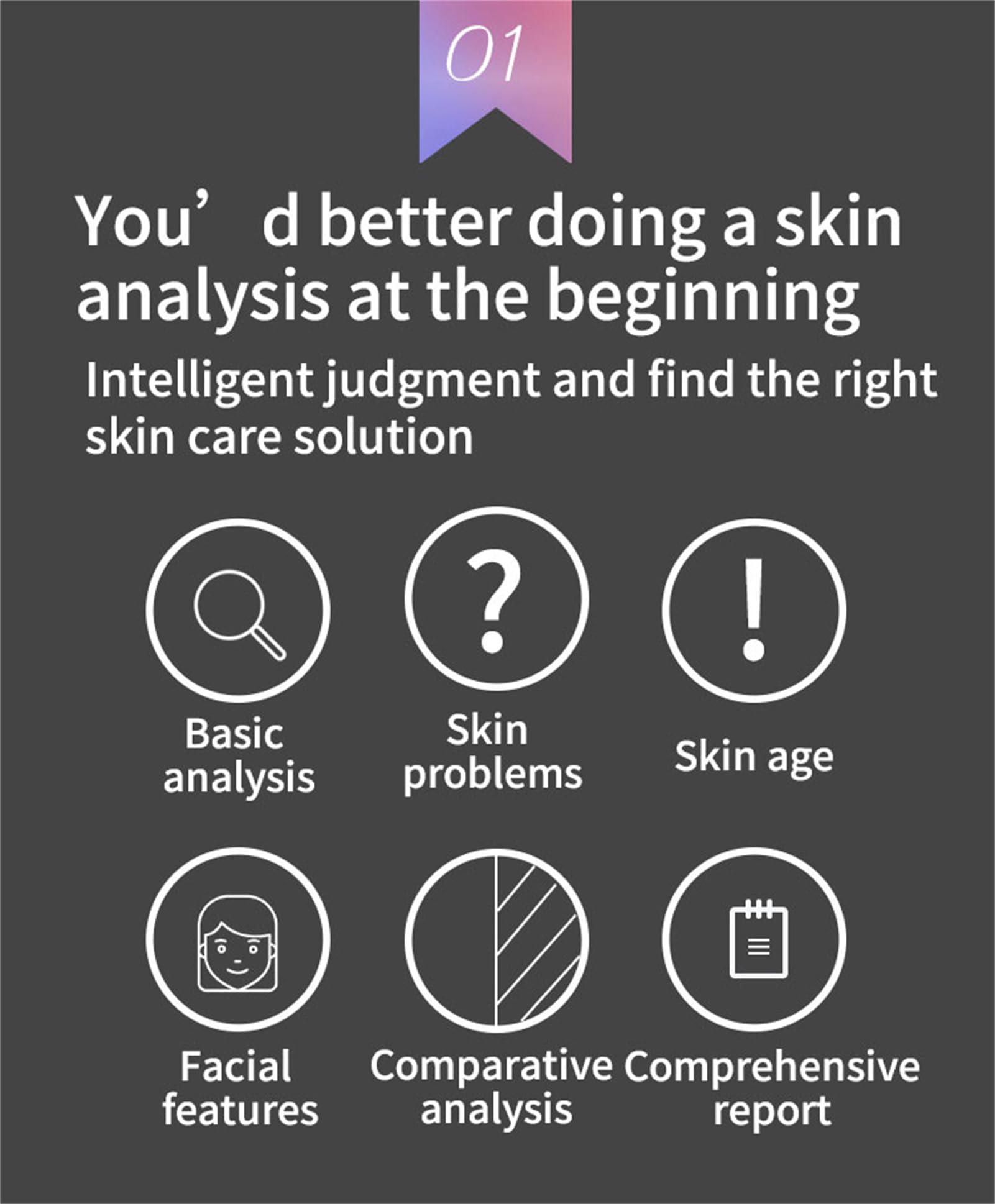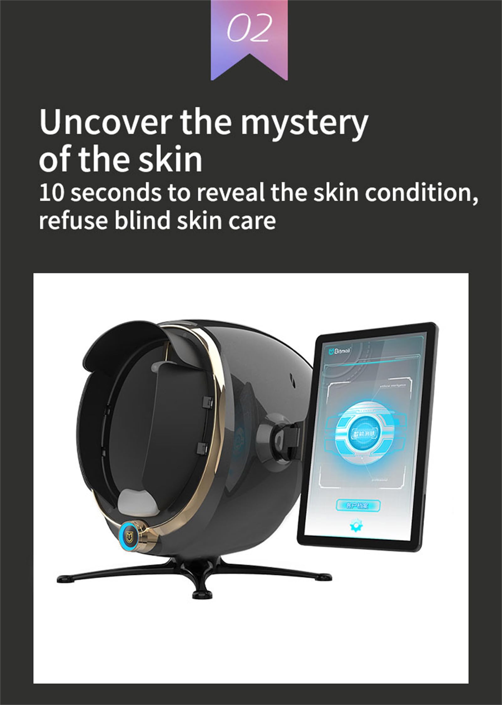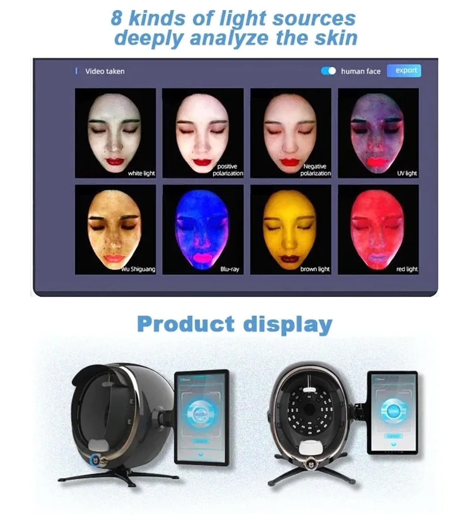 Description Product performance description The image is clearer and the analysis is more accurate RGB white light, positive polarization, negative polarization, blue 405, wu shi light, red light, brown lightComprehensive analysis of 14 skin indicators . Through 28 million hd pixels to obtain facial skin image conditions, using 8 spectral imaging technology AI face recognition technology, deep learning technology, 3D simulation technology, cloud computing cloud storage, the pathological features of the skin are quantitatively analyzed on the surface and deep layer, and 14 skin health indicators can be detected. Comprehensively analyze and evaluate skin problems, so as to carry out scientific and accurate skin management with reasonable basis . Product features 40 filters protect your skin from any side effects of light . regularly upgrade version ,network interruption automatically switches to the local end ,cloud computing and cloud storage. Type: Skin Analyzer Illumination (RGB): 8,800 Lux Warranty: 1 Year Color temperature: 7200 K Feature: Skin Wrinkle analysis, Pigmentation analysis, Acne analysis, Detect Skin Moisture Light: White light, Polarized light, Ultraviolet light Image features: 1/1.7''CCD sensitization device, Max resolutions 4000x4000 pix Signal output interface: USB2.0 Preview output mode: 16:9 Working environment: 10 – 35 Celsius degrees Resolution: 28 million HD Pixels Video Output Mode: NTSC/PAL Input: AC 100/240V 50/60Hz