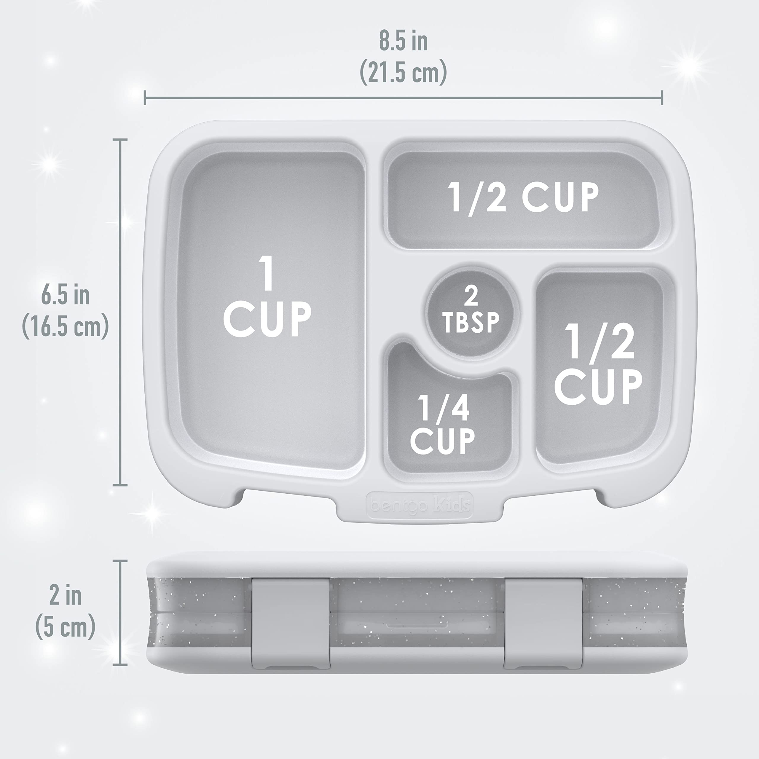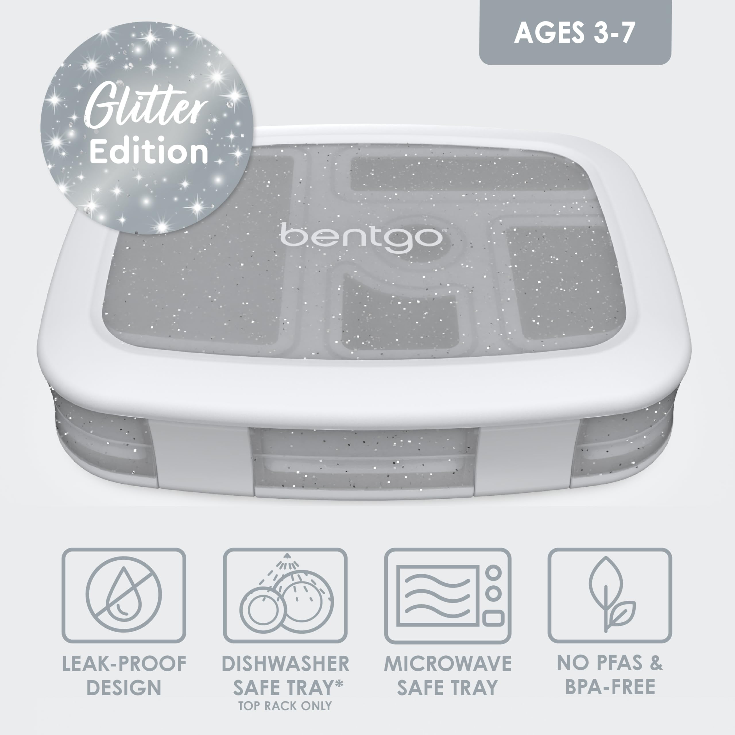 Fiambrera Bentgo Kids de 5 compartimentos, diseño con purpurina para la escuela, ideal para edades de 3 a 7 años, a prueba de fugas, a prueba de caídas, apta para lavavajillas y fabricada con materiales sin PFAS ni BPA (edición con purpurina, plateada)
