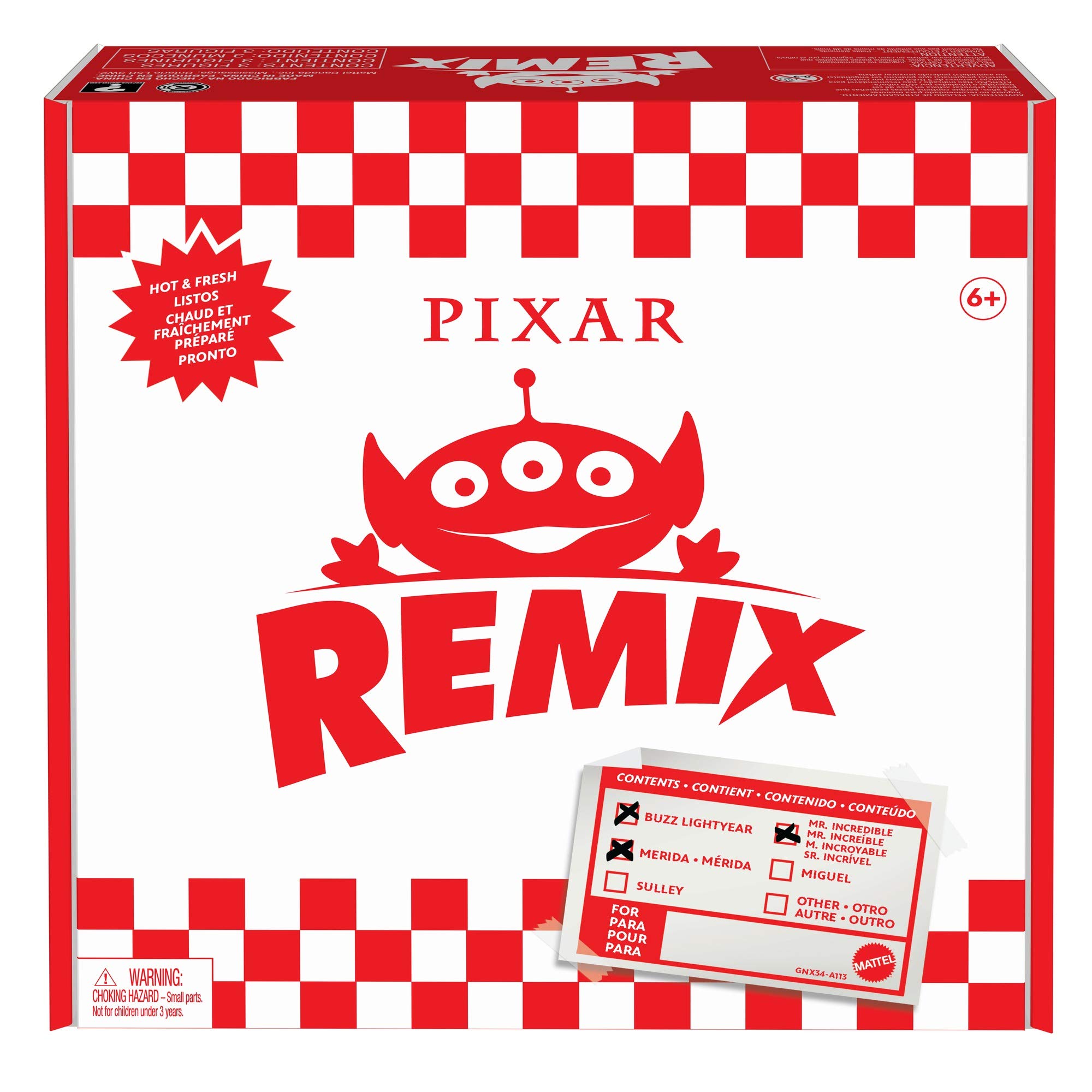 Enjoy the beloved Pixar Aliens like never before – in disguise as characters from across the Pixar universe! These hilarious mashups include favorite films and heroes Mr. Incredible from The Incredibles, Buzz Lightyear from Toy Story and Merida from Brave! Adorable, colorful, 3-inch scale figures are sure to inspire creative story adventures. Their playful retro pizza box packaging delivers added fun and makes an excellent gift for fans and collectors. Nothing's better than a combo of pizza, great movies, beloved characters and laughs! Colors, decorations and dimensions may vary.