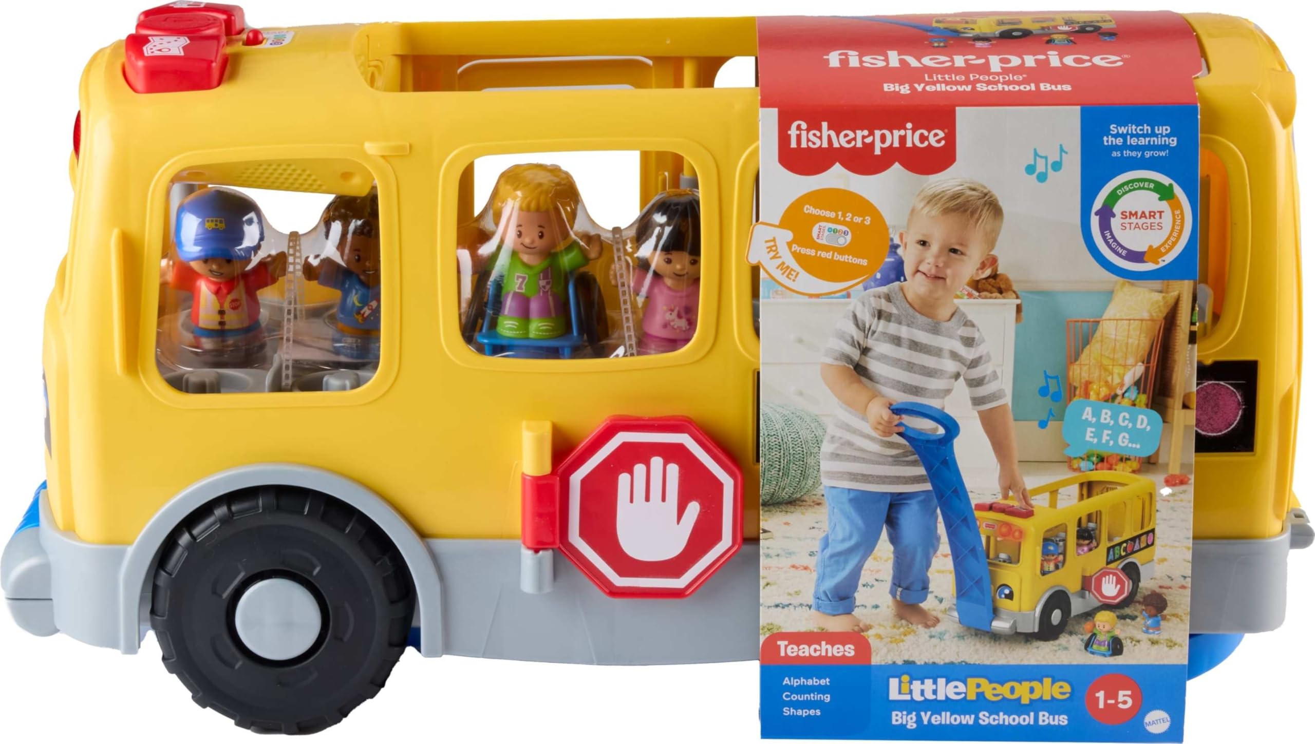 Toddlers can embark on all sorts of exciting field trips with the Little People Big Yellow School Bus from Fisher-Price. This extra-large, push-along toy bus comes with 4 Little People character figures, a pull handle, and realistic features like an opening door, stop sign and wheelchair ramp. As kids roll from one adventure to the next, the bus’s playful songs, sounds, lights and phrases help teach the alphabet, counting, colors and more, with three Smart Stages levels that grow along with your child. And with space to seat up to 12 figures, your little explorer can bring all their Little People friends along for the ride! (Additional figures sold separately.) Use the globe button to select a language: English, Spanish, French, or Brazilian Portuguese. Colors and decorations may vary.