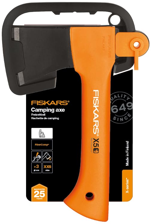 Product Description Camping hatchet (total length: 23 cm) for splitting small logs, cutting branches up to 3 cm in diameter and cutting small wood for the fireplace, stove, barbecue or campfire, also suitable for carving, camping, hiking, bush craft, survival and outdoor activities- Very sharp blade in hardened steel with coating, Ideal balance between head and handle for maximum swing power- Ultra-lightweight, durable handle made of ultra-lightweight, weather-resistant fibreglass reinforced plastic, Handle moulded directly onto the tool head for greater safety, Firm and comfortable grip thanks to innovative handle tip with flared finger guard for optimum finger protection- Made in Finland, Long life product, Easy to sharpen the blade with a blade sharpener (available as part number: 1000601), Storage case included for safe transport- Contents: 1x Fiskars Camping Axe XXS X5, Storage and Transport Case Included, Length: 23 cm, Weight: 560 g, Material: High Steel/Fibreglass Reinforced Plastic, Colour: Black/Orange, 1015617 Set Contains: 1x Fiskars Camping Axe XXS X5, Storage and Transport Case Included, Length: 23 cm, Weight: 560 g, Material: High Steel/Fibreglass Reinforced Plastic, Colour: Black/Orange, 1015617