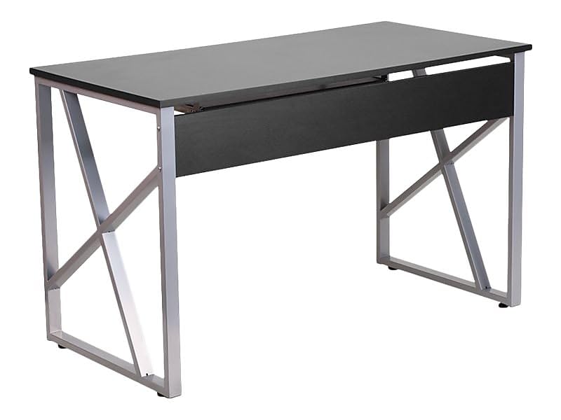 -Bring function to your workspace while maintaining your impeccable sense of style. The light coolness of the metal frame is a striking contrast to the black laminate finish top giving this desk a trendy upscale style that works in any space.
