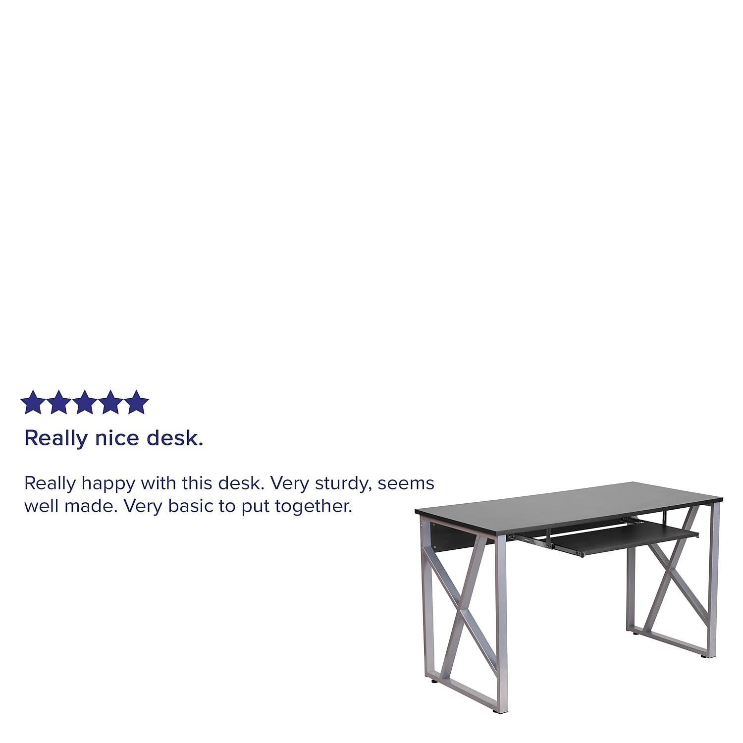 This smartly designed, black computer desk is an attractive work space where you can use your computer and still have plenty of room for your writing materials and desktop accessories. The contemporary design features a rectangular black laminate top, a space-saving, sliding keyboard tray and attractive, silver powder coated, designer cross braces on both sides. Self-leveling floor glides keep your desk from wobbling on uneven floor surfaces and protect your floors by sliding smoothly when you need to move the desk. A panel, across the front, reinforces the frame as well as offering some privacy to the desk's occupant. This computer desk offers a sensible and stylish option to furnish your home office, dorm room or studio apartment.