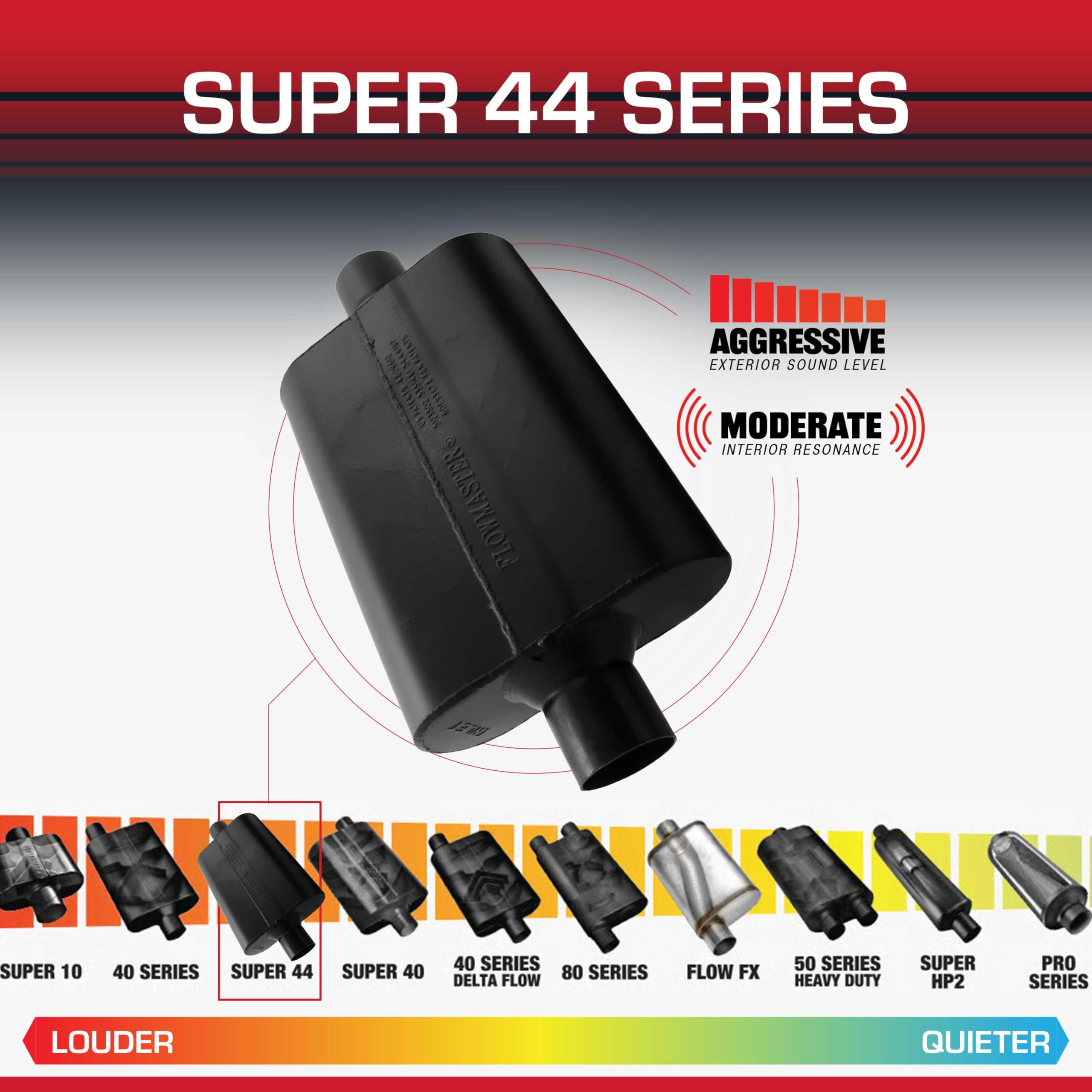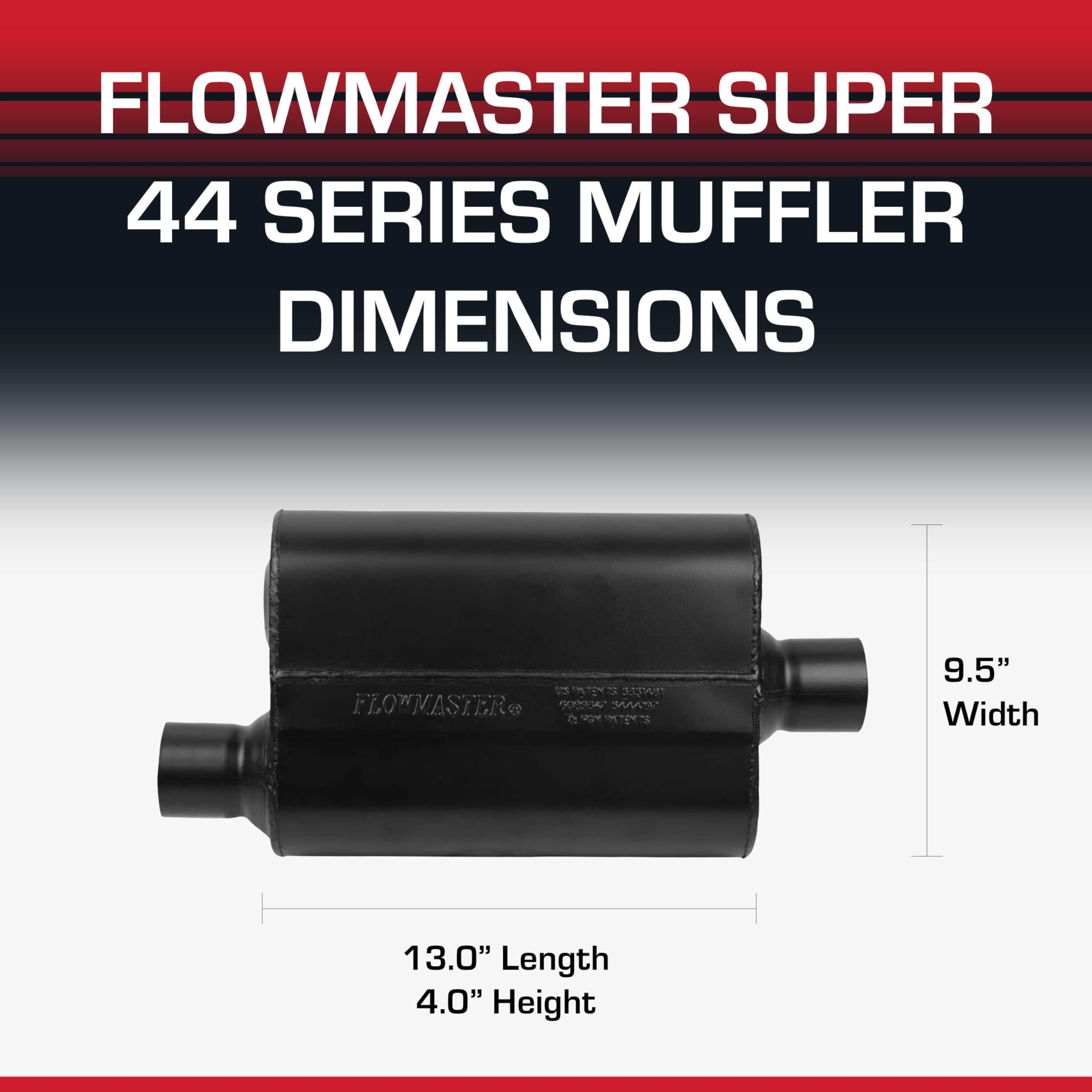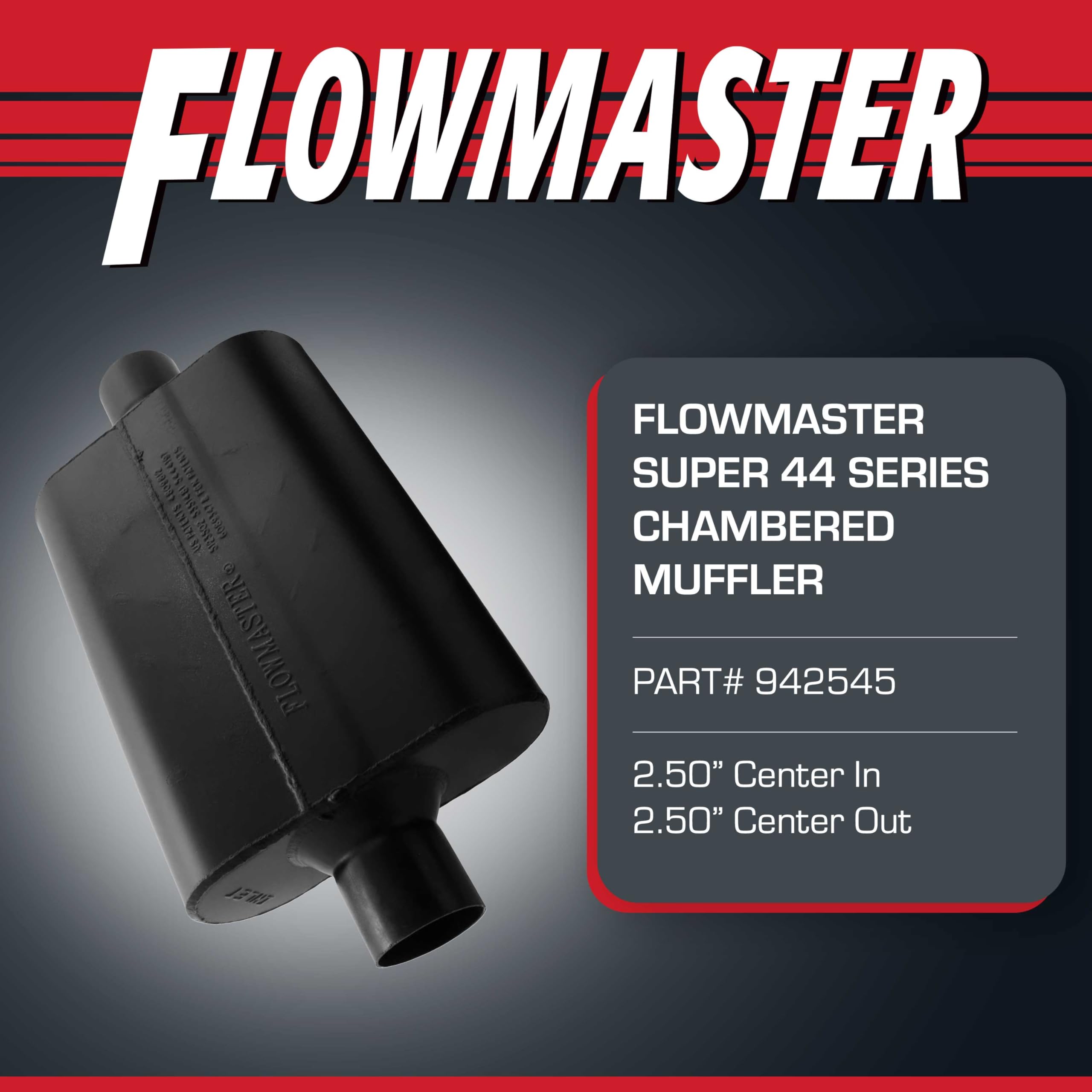Silenciador con cámara Flowmaster Super 44 Series - 2.50" - Entrada central/Salida central - Sonido agresivo - Acero aluminizado calibre 16 - Para Muscle Cars clásicos y tardíos, Street Rods, camionetas, SUV (942545)