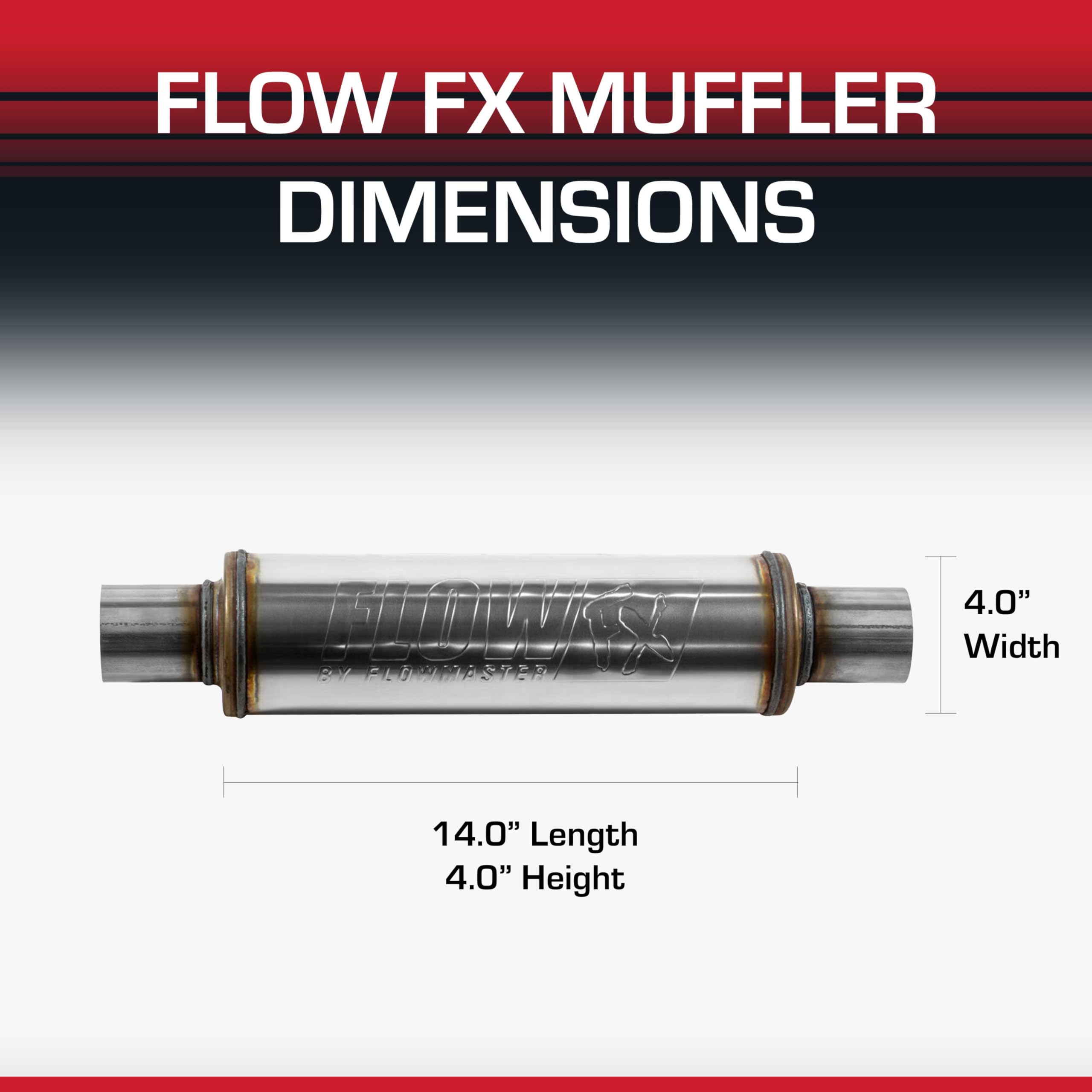 Refined Sound. Proven Performance. The Flowmaster® Flow FX Series Muffler is the perfect upgrade for drivers looking for high performance with a moderate sound profile. Designed with a straight-through internal layout and high-temp sound-absorbing materials, it delivers a deep, mellow tone — ideal for muscle cars, trucks, SUVs, and daily drivers who want a smooth tone without excessive drone. Built from 409 stainless steel, the fully MIG-welded case is durable enough to resist rust, vibration, and high heat, while the embossed Flow FX logo and natural finish give it a clean, show-worthy look. The large-diameter perforated core supports optimized flow by reducing back pressure and unlocking extra torque and horsepower. This muffler is reversible and universal, making it easy to install in tight spaces or custom setups — from classic muscle cars and restomods to compact cars, trucks and modern builds. Features: Straight-through core for optimized flow and performance - Moderate exterior sound with minimal cabin drone - 409 stainless steel construction with a clean, natural finish - Reversible and universal design for flexible installation