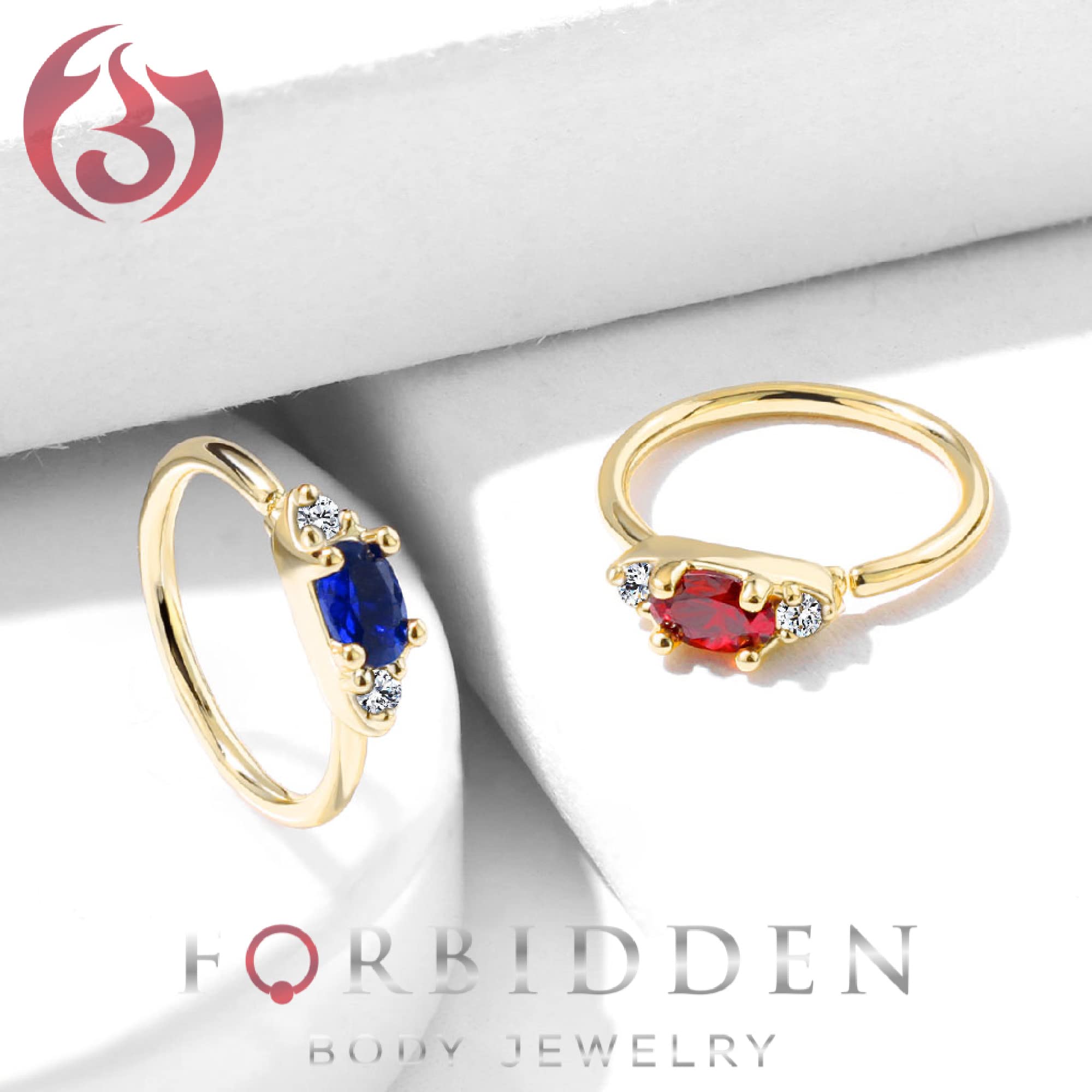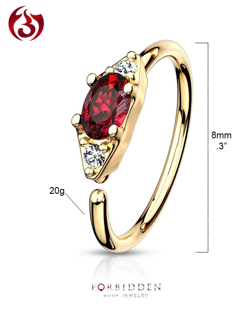 Forbidden Body Jewelry 20 g 8 mm doble circonita cúbica roja ovalada centrada en aro de nariz/torre/hélice de acero quirúrgico chapado en oro de 14 quilates flexible