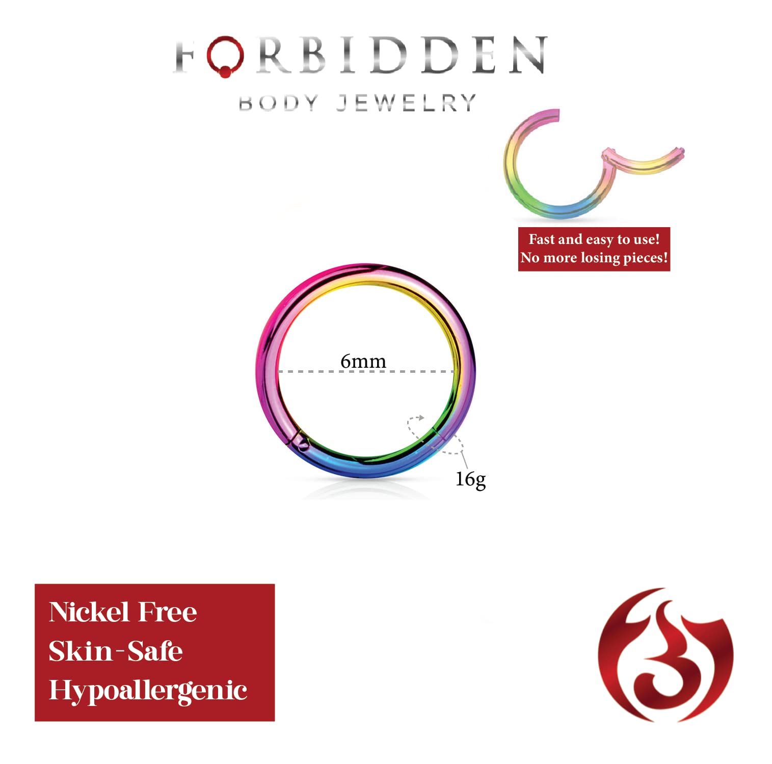 Forbidden Body Jewelry Aro para nariz sin costuras con bisagras de acero quirúrgico 316L, 14G, 16G, 18G, diámetro 6 mm, 8 mm, 10 mm, 12 mm, colores oro/oro rosa/plata/negro/arco iris.