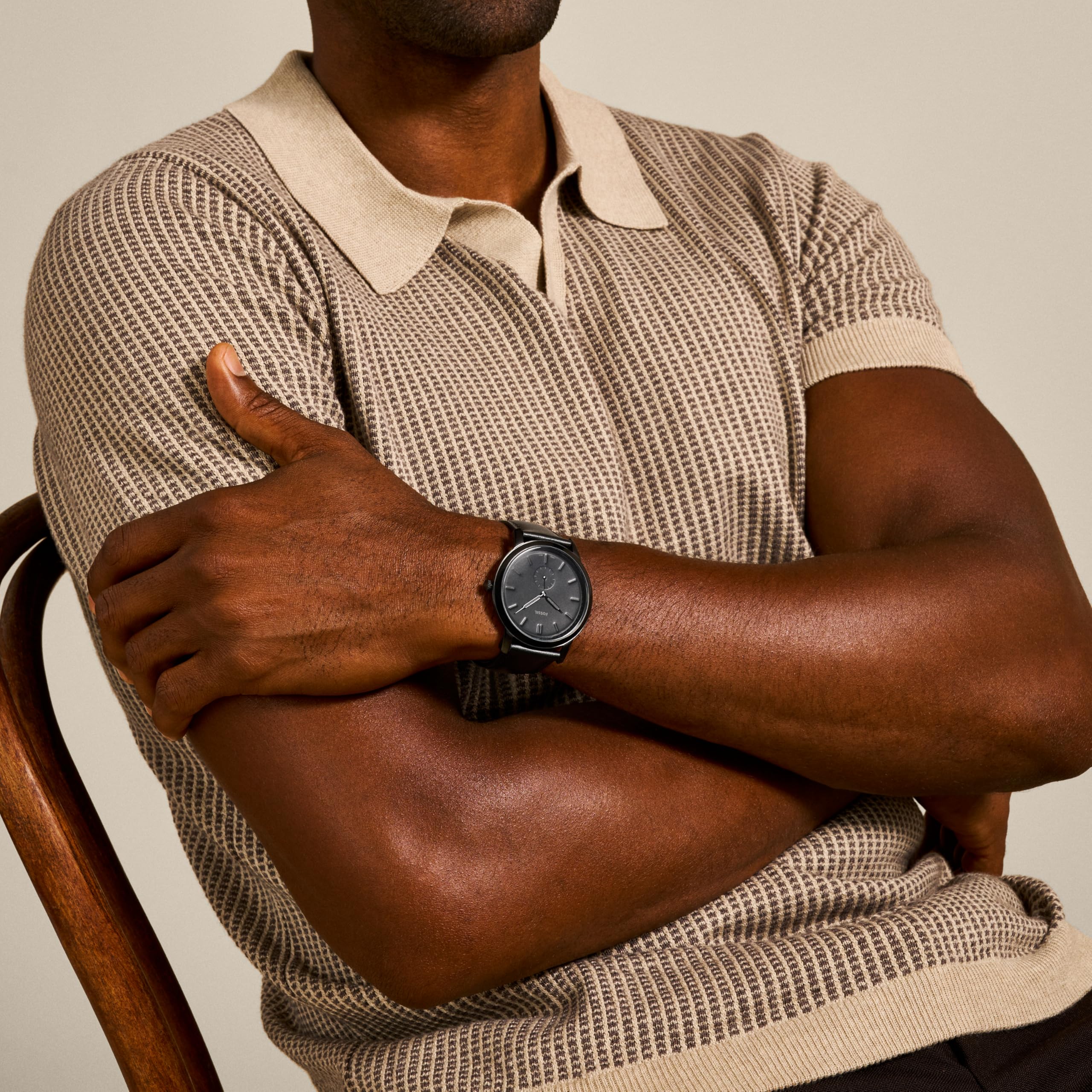 -This 44mm Minimalist features a monochrome color palette with a black dial, matching leather strap and two-hand movement. Inspired by the clean lines and minimalism of mid-century modern design, this slim timepiece was built on the principles of balance and proportion. With an unassuming dial and lumed stick hour markers, it’s a simple, uncluttered and functional watch.