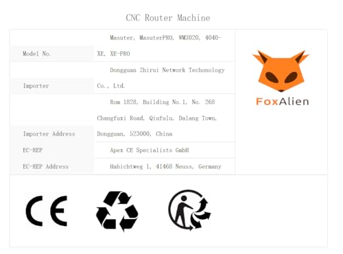 FoxAlien 4040-XE is an CNC router with large engraving area of 15.75”x15.75”x2.56” (400x400x65mm), which has a powerful 300W spindle and support up to 15000mW module. 4040-XE is an extreme and advanced CNC router in FoxAlien family. With the powerful spindle and stepper motors, it has better performance and high accuracy in engraving and cutting different types of material. Specifications: Model: 4040-XE Active Working Area: 15.75 x 15.75 x 2.56 inch (400*400*65mm) Spindle Power: 300W Stepper Motor: NEMA 23 Accuracy: 0.1mm Maximum Moving Speed: 2000mm/min Input Voltage: 110V/220V Input Current: 110V/10A; 220V/5A Control Method: Computer & Controller Support Software: Compatible with Grbl-control software Support OS: Windows XP/7/8/10, Linux, Mac OS Machine Size: 29.92 x 24.4 x 14.17 inch (760*620*360mm) Package List: 1x 4040-XE CNC Router (main parts pre-assembled) 1x Controller 1x 300W Spindle 1x MDF working table 10x Engraving Bits 10x Nano Blue Coating End Mills (0.8mm-3.175mm, 1/8” shank) 4x Hold-down Clamps 1x Power Supply 1x USB Card Reader 1x Memory Card 1x Z Probe 1x User Manual Packs of screws and tools