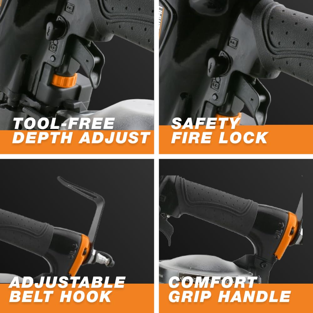 -USER-FRIENDLY DESIGN: Includes a transparent nail bucket, no-mar safety tip, comfort grip handle, 360° adjustable exhaust, metal belt hook, and extra safety tip for convenience and comfort.
