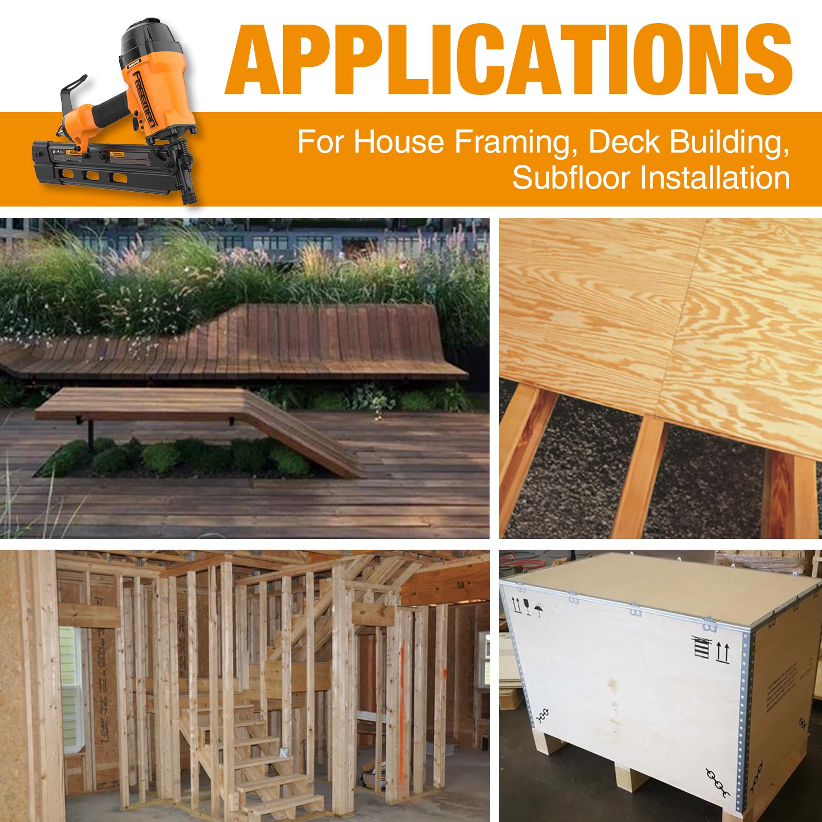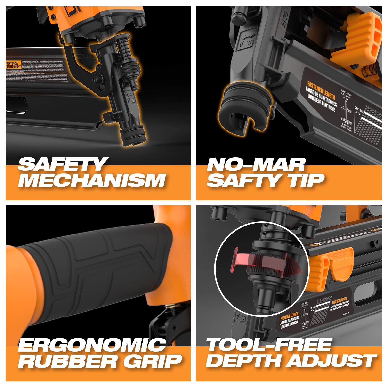 -Compatible Nails: Accepts 21° plastic collated full round head framing nails from 2" to 3-1/2", 0.113" – 0.131" diameter