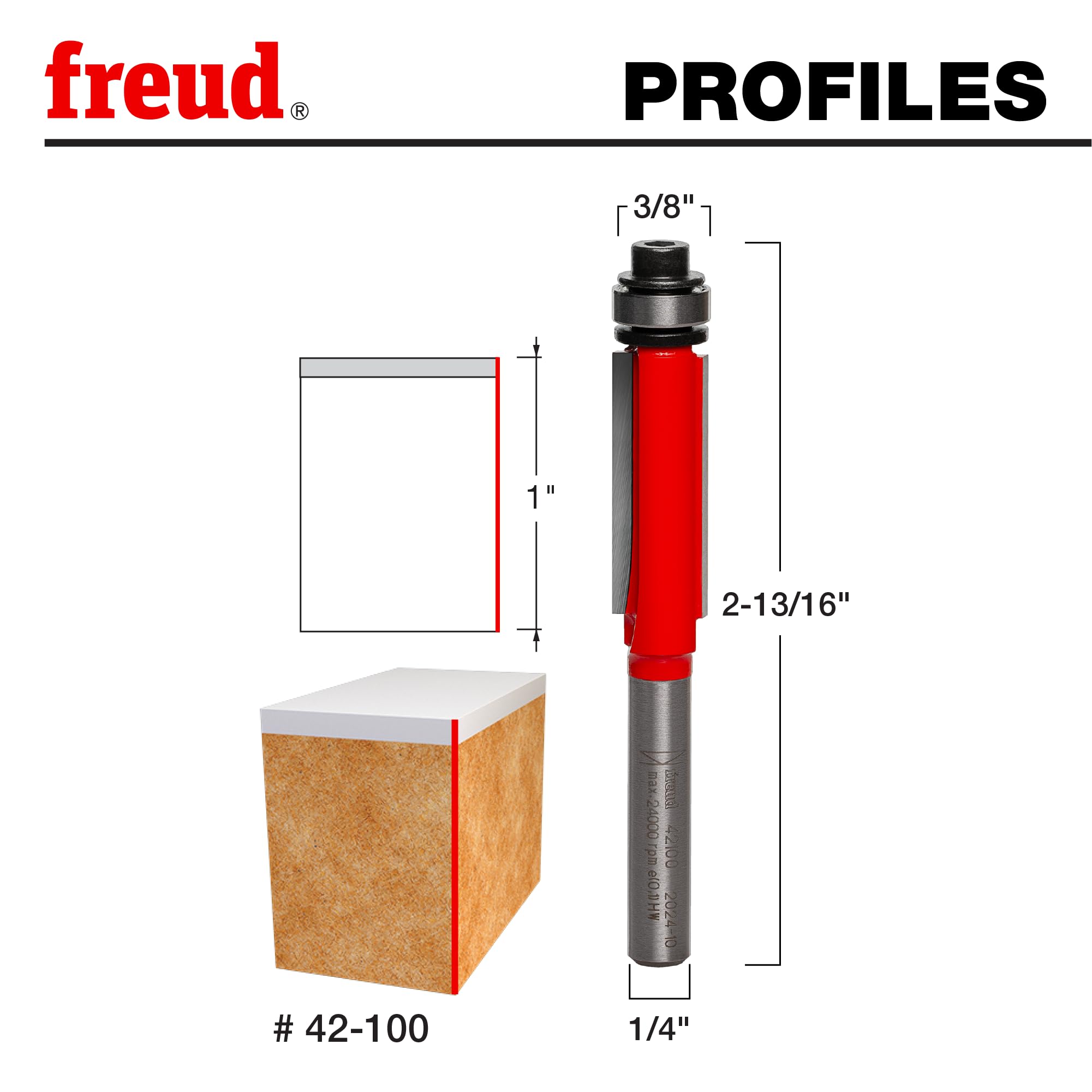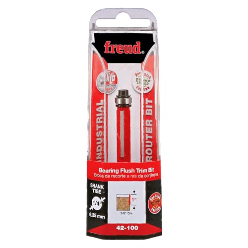 The Freud 42-100 – 3/8" Bearing Flush Trim Bit is designed for precision trimming and pattern routing. With a 3/8" diameter and a 1/4" shank, this bit is ideal for trimming laminates and following patterns to create or duplicate intricate shapes. The 3/8" bearing allows for smooth, burn-free cuts along flush edges, ensuring a clean, professional finish every time. Made with Freud’s TiCo Hi-Density Carbide, this bit ensures long-lasting sharpness and durability, allowing for smooth, precise cuts in hardwoods, softwoods, plywood, composites, and laminates. The two-flute design improves cutting efficiency, providing faster material removal while ensuring a smooth finish. With a maximum RPM of 24,000, the Freud 42-100 delivers reliable, high-speed cutting performance, making it suitable for both high-production applications and detailed work. Whether you're routing intricate patterns or trimming laminate countertops, this bit provides the precision and durability needed to achieve professional-quality results.