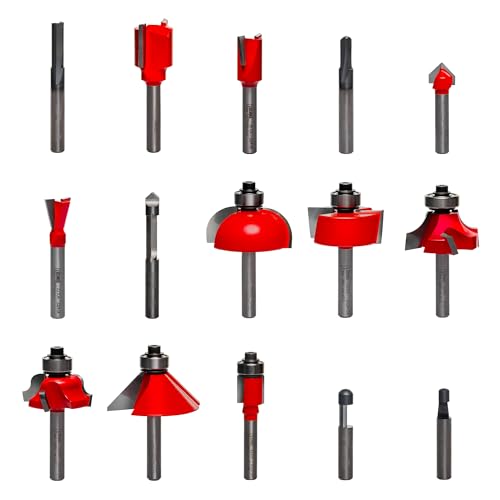 Product Description 15 Piece Advanced Bit Set From the Manufacturer This set offers you a large variety of useful bits, from V-grooving to flush trimming, chamfering, and dovetailing. All of the bits are 1/4-inch shank, solid carbide or carbide tipped, and sharpened to a razor-sharp edge for super smooth results. They come in a wooden box; will cut all composition materials, plywood, and softwood; and can be used on handheld and table-mounted portable routers.