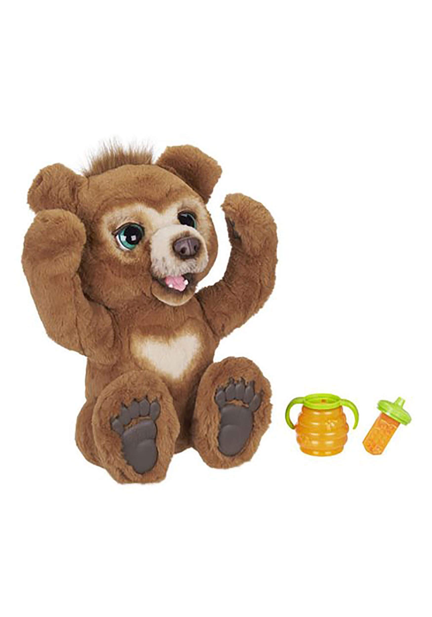 Fur Real Cubby, The curious bear interactive plush toy is a dream companion for kids ages 4 and up – one who’ll excitedly take part in all their adventures, and snuggle next to them at the end of day. Cubby is a curious young Cub, and is eager to be picked up and held (he hugs you back!), play peek-a-boo, and even dance from time to time.And let's not forget snack time! Feed him his bottle or treat and he'll make eating sounds.He's a Chatty little bear, too – he babbles back when he's spoken to. In nighttime mode, This Cutie closes his eyes, makes sleepy sounds, and plays one of four 5-minute sequences of soft music. Sweet dreams, cubby! with moving eyes, nose, and mouth, his face is delightfully expressive – a totally loveable cub! furreal and all related properties are trademarks of Hasbro.