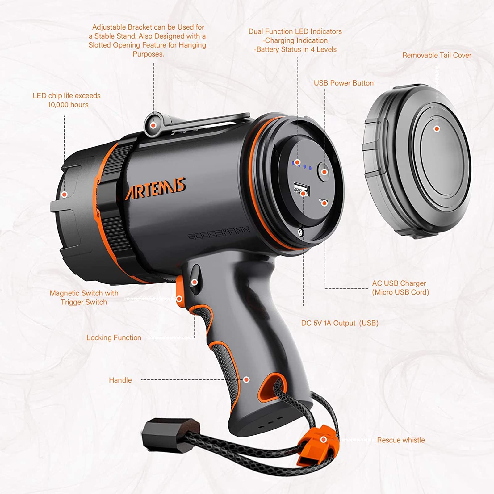 GOODSMANN Foco marino recargable LED de 2000 lúmenes, foco de mano, reflector impermeable, linterna portátil para barco con interruptor de bloqueo y cable USB para pesca al aire libre, senderismo, caza GOODSMANN Foco marino recargable LED de 2000 lúmenes, foco de mano, reflector impermeable, linterna portátil para barco con interruptor de bloqueo y cable USB para pesca al aire libre, senderismo, caza