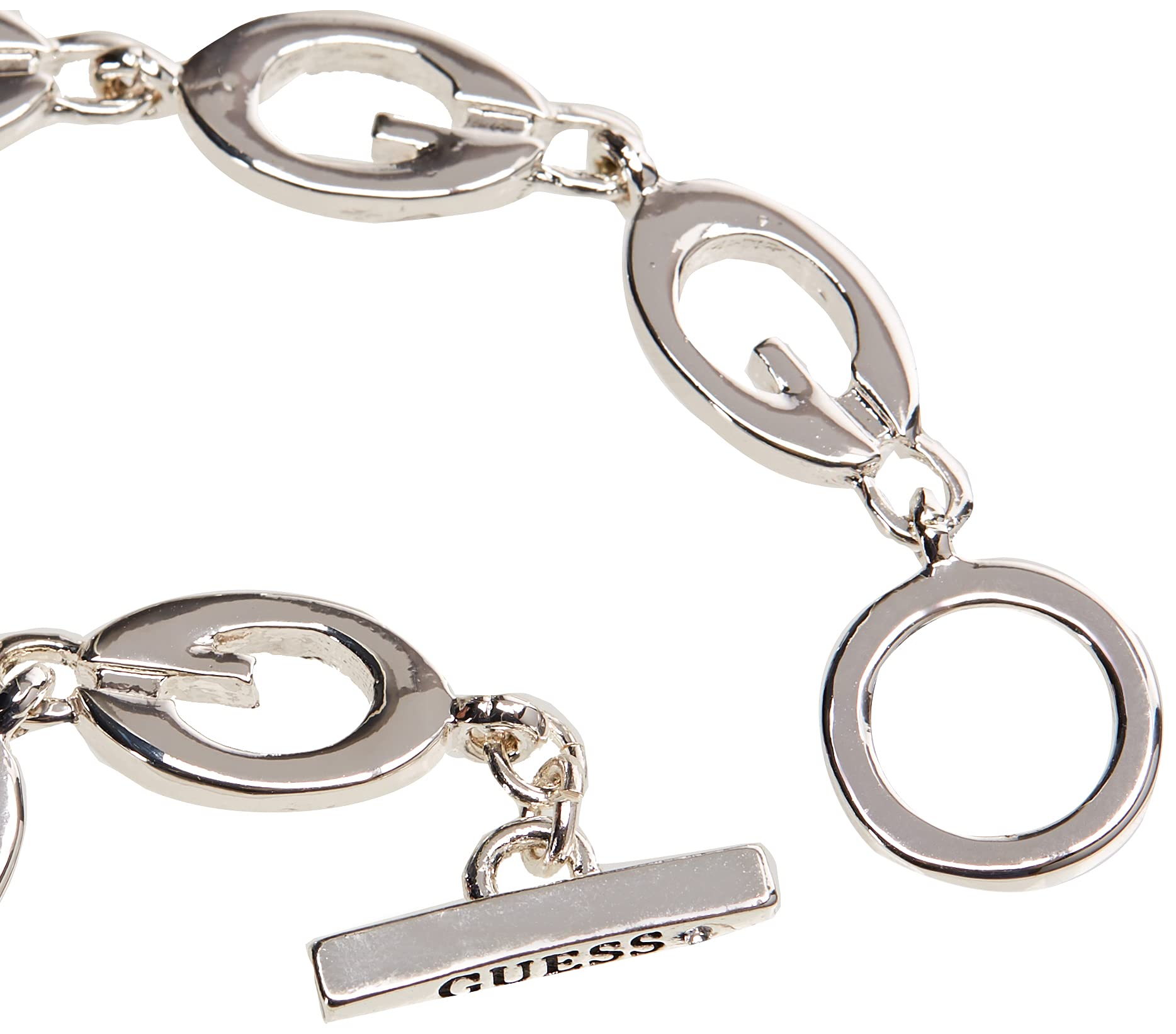 Description Add some style to your wrist with this beautiful GUESS Silver-Tone Logo G Link Toggle Bracelet. Made from high-quality materials, this bracelet features a sleek and modern design that is perfect for any occasion. The silver-tone metal and logo G links give it an elegant and sophisticated look, while the toggle closure ensures a comfortable and secure fit. With a length of 7.5 inches, this bracelet is perfect for any wrist size. It's a great addition to any jewelry collection and makes a wonderful gift for yourself or a loved one.