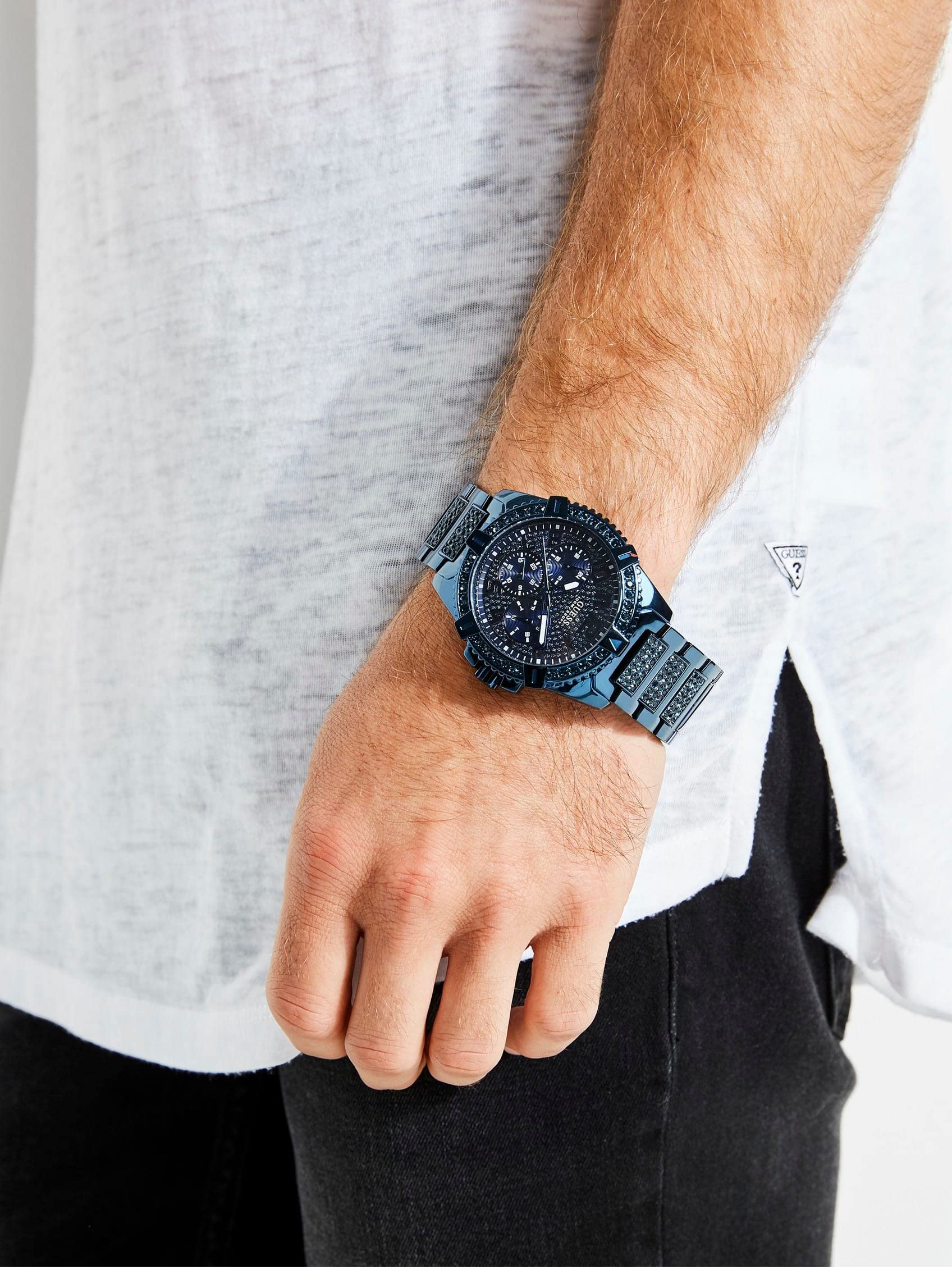 GUESS Reloj de pulsera icónico con adornos de cristal azul de acero inoxidable con día, fecha + hora militar/internacional de 24 horas. Color: Azul (Modelo: U0799G6)