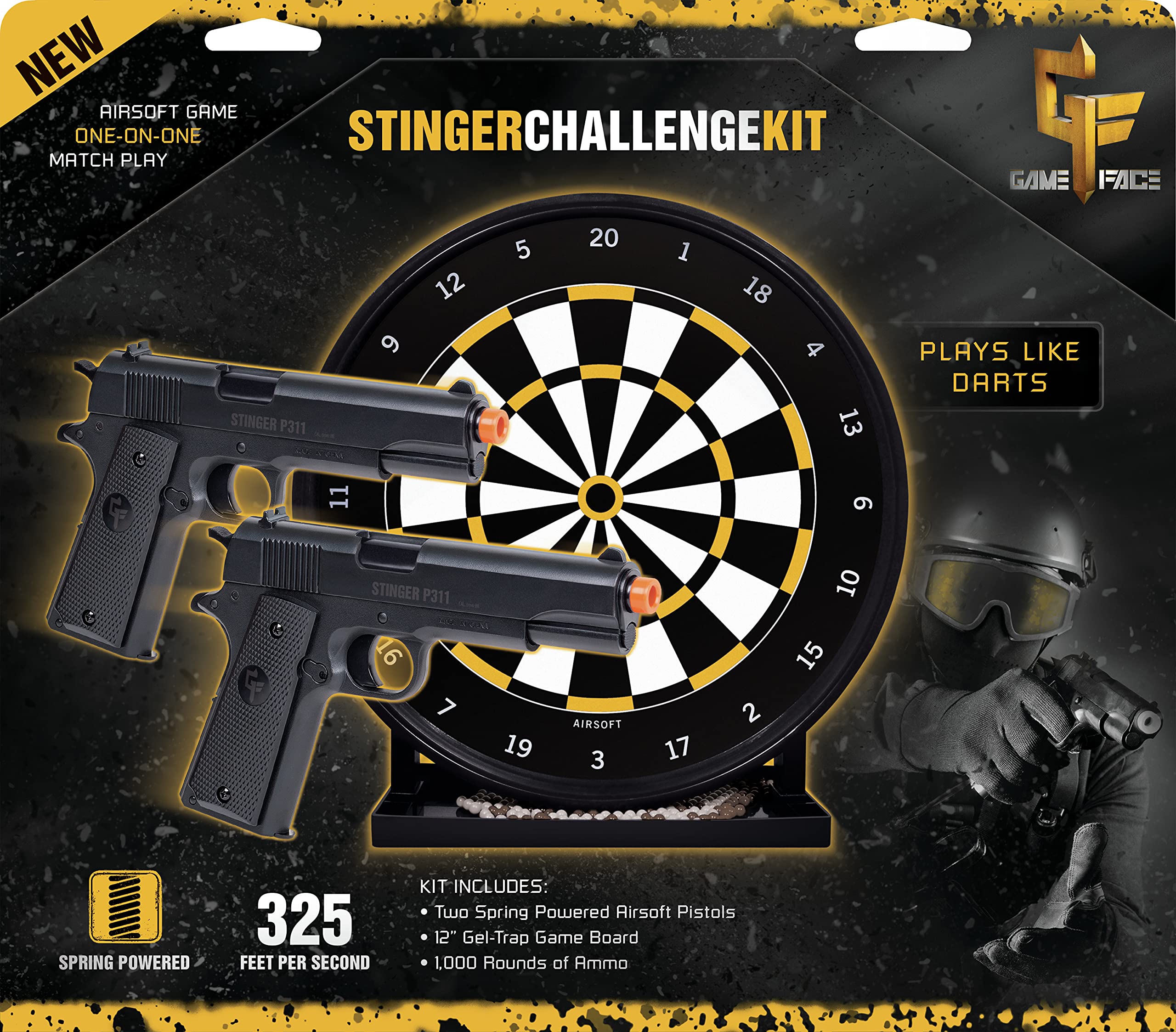 As much fun as darts, the Stinger Challenge Kit features two (2) P311 Stinger Airsoft repeater pistols that hold up to 12 6mm Airsoft BBs each and shoot at velocities of up to 275 fps. The Airsoft Gel-Trap Target has rings for scoring and the tray at the base catches BBs for easy clean up. Two packages of 500 count . 12-gram Airsoft BBs are included, in two different colors, to make scoring easy. "Be the Game with GameFace"