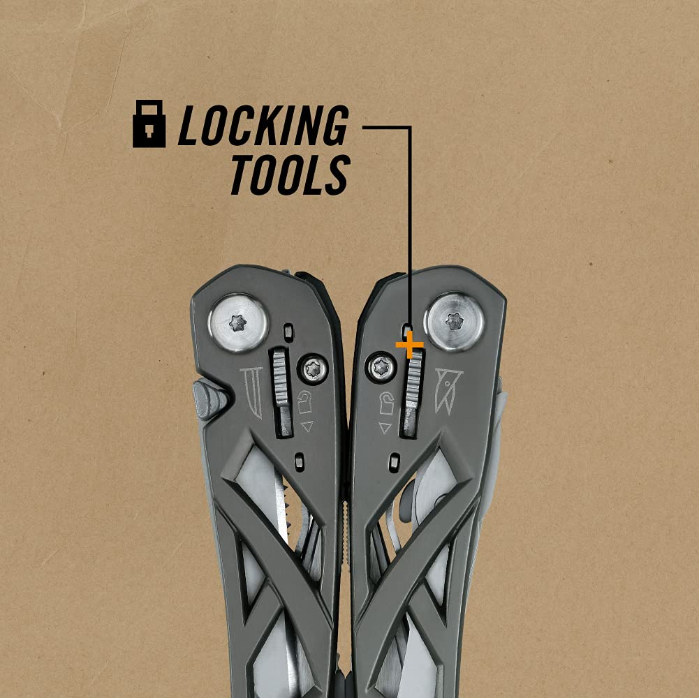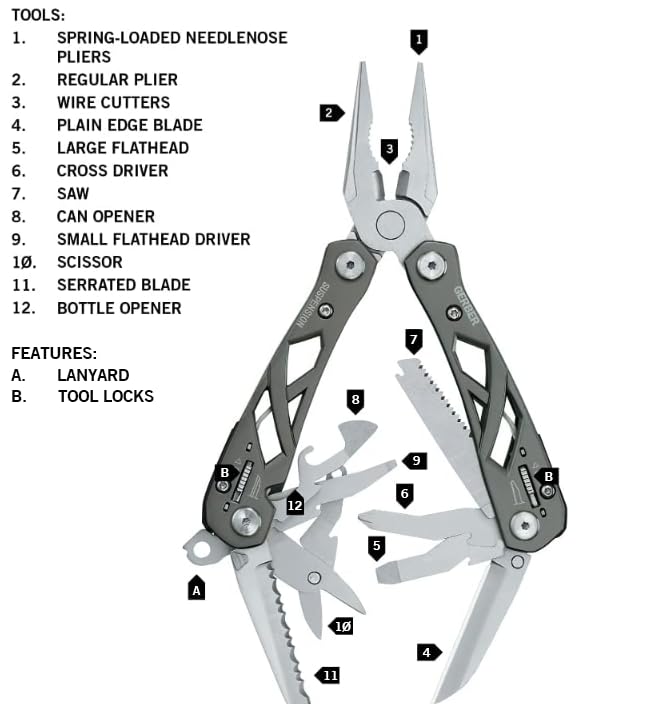 -MULTI-TOOL (12-IN-1): Features needle nose pliers, wire cutters, serrated and plain edge blades knife set, cross driver and flat head small screwdriver set, can opener, bottle opener, trimming scissors, tool lock, and lanyard hole