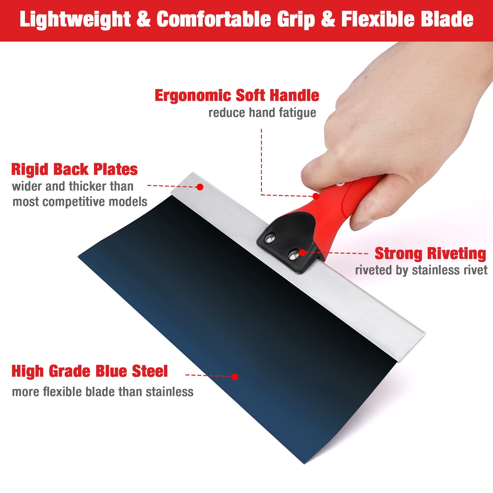 -Blue Steel Taping Knife: 10" wide drywall knife made of blue steel for maximum flexibility to reduce hand fatigue and make a better finish and faster application rates. Rigid back plates wider and thicker than most competitive models