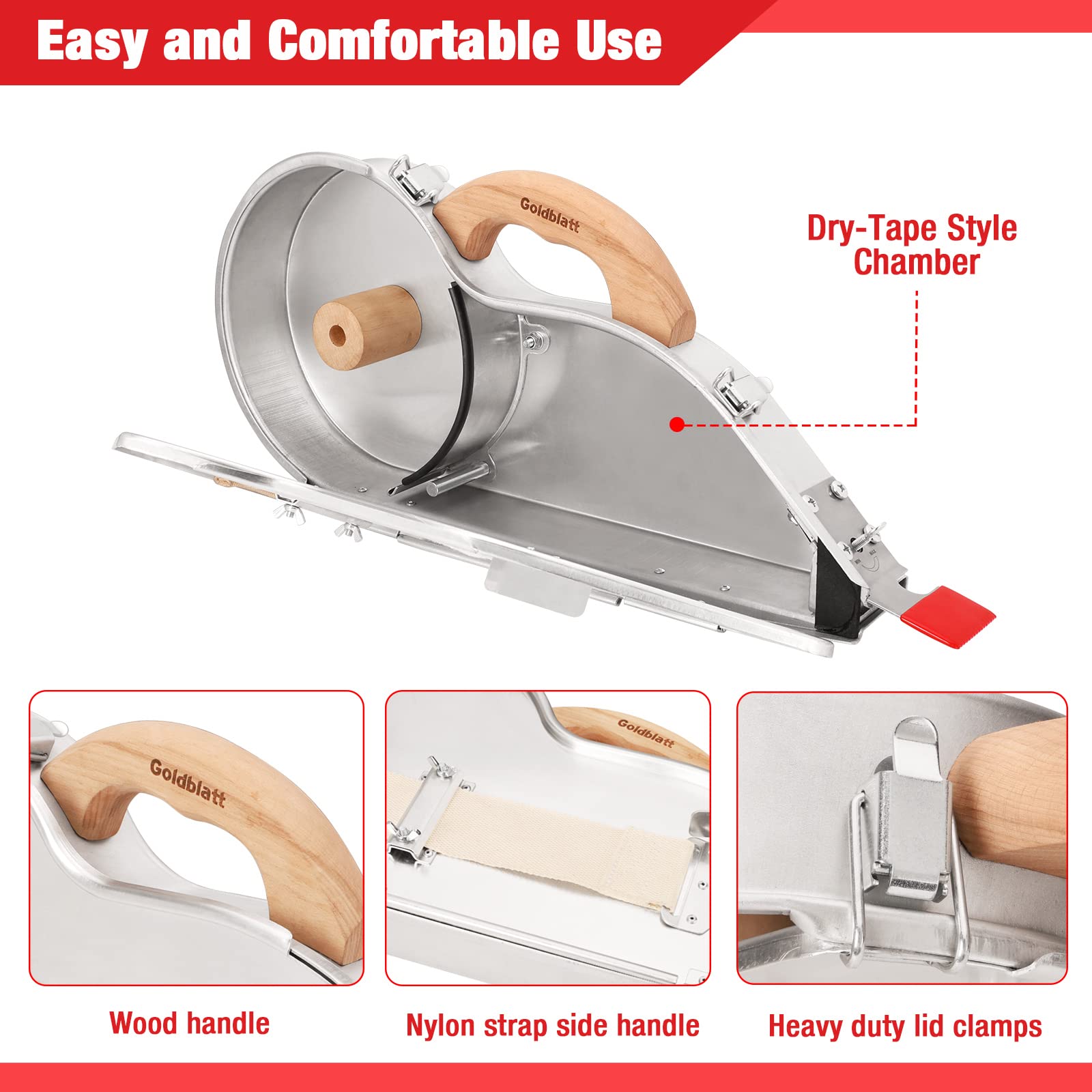 -Banjo Dry Taping Tool: Made of high quality aluminum alloy, lightweight and rust resistant. Designed with dry tape style chamber can be used for thinner compounds, will make the putty better adhere to the tape. Serrated tip blade can easily and quickly cut off the tape. Easy thumb screw adjustable valve in the front controls how much compound is applied. Strong heavy duty lid clamps will lock firmly to prevent liquid leakage