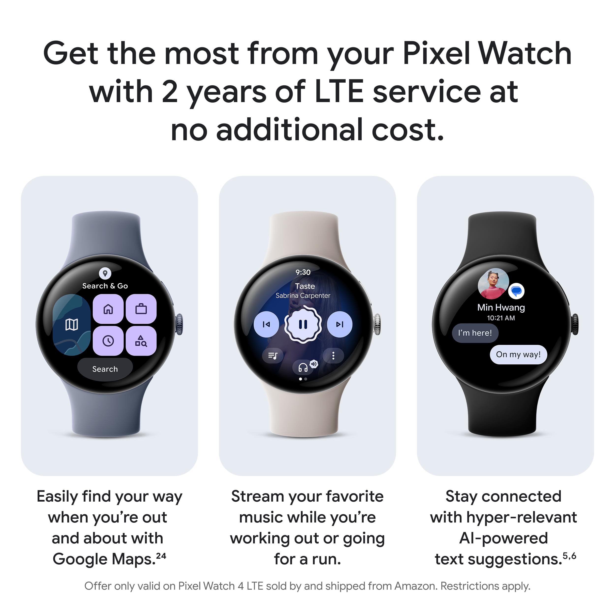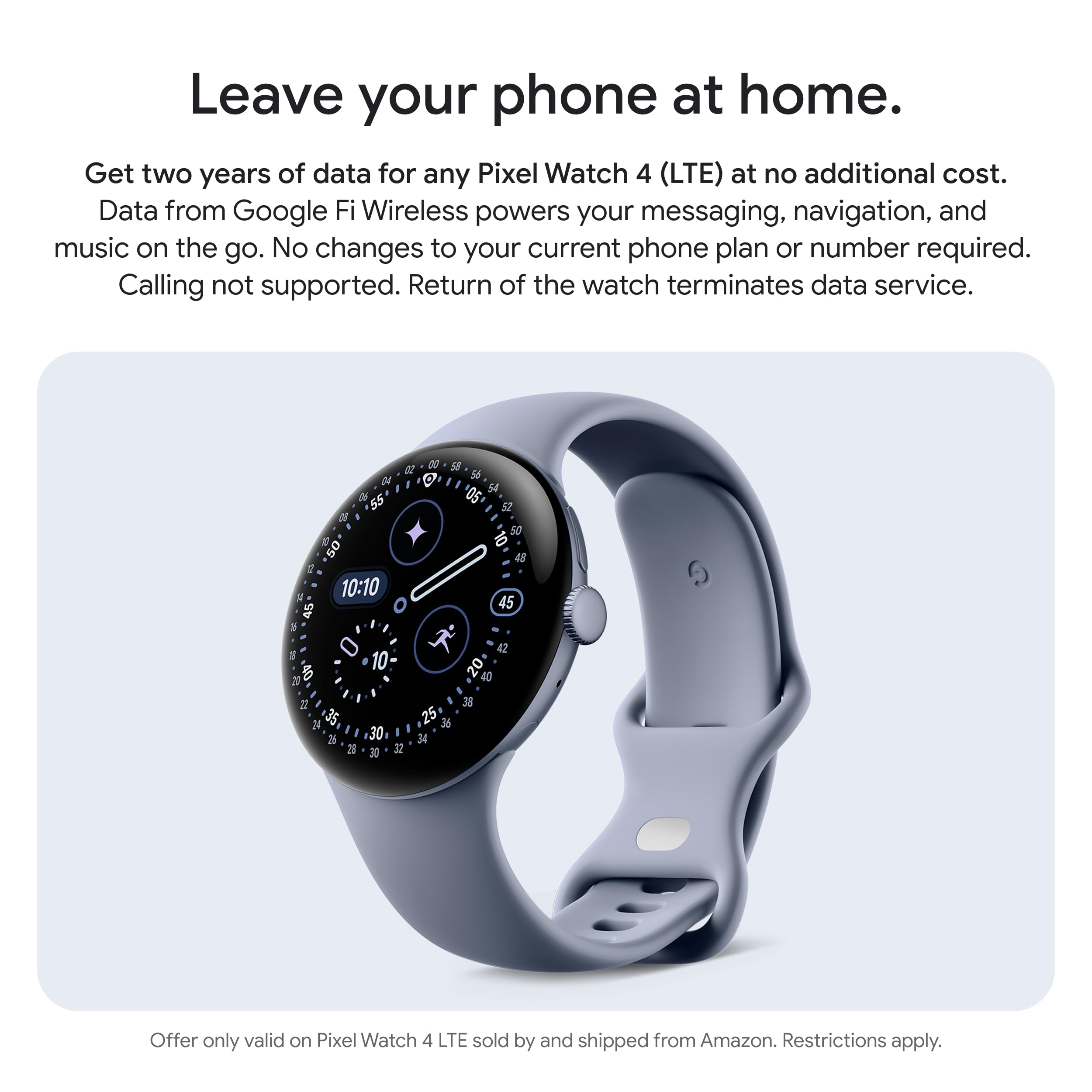 -Get 2yrs of data and texting at no extra cost when you buy Pixel Watch 4 LTE[23]; Google Fi powers your messaging, navigation, and music on the go; offer only valid on Pixel Watch 4 LTE sold by and shipped from select sales channels